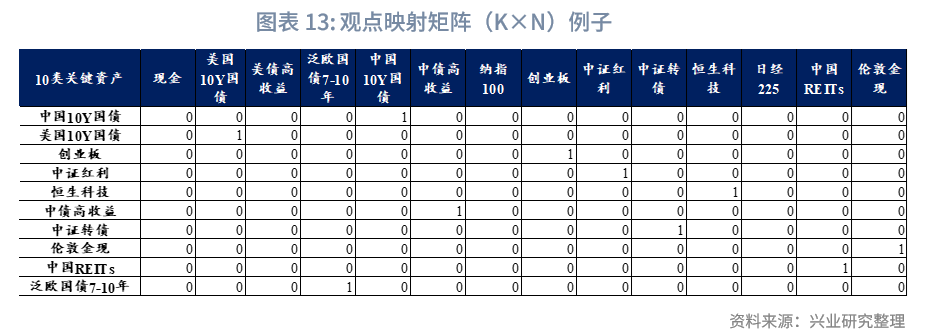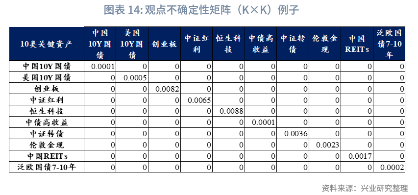 观点映射矩阵P:从当前可投资资产中筛选关键资产,构建维度为K×N的观点映射矩阵P(K为关键资产数量,本文为10,N为全部可投资资产数量,本文为14)。矩阵中每一行对应一个观点的资产权重向量,仅在对应关键资产位置赋值1,其余位置为0,以此清晰标识观点所针对的具体资产。