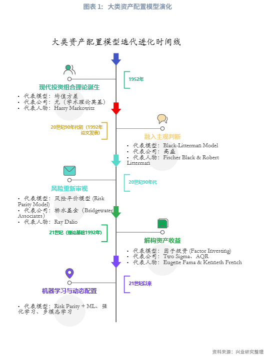 资产配置模型的演进可划分为四个阶段:以均值-方差(MVO)模型为代表的现代投资组合理论;以Black-Litterman(BL)模型为核心的主观观点融合阶段;以风险平价(Risk Parity)为标志的风险再平衡阶段;以及以因子投资为主导的收益解构阶段。