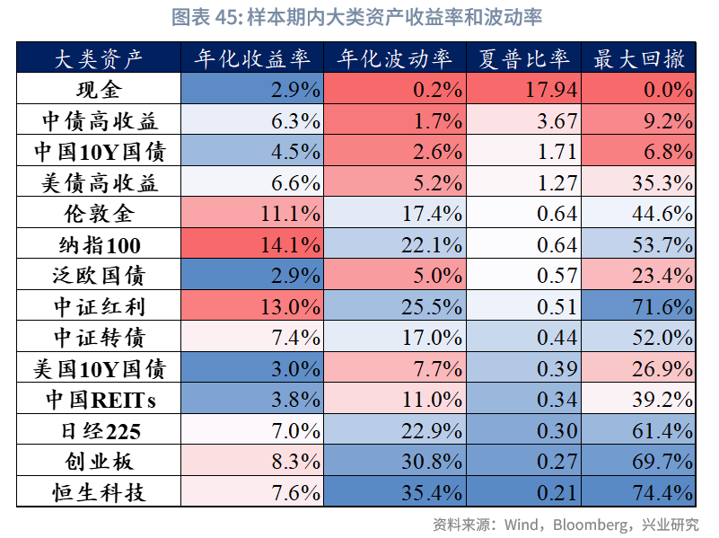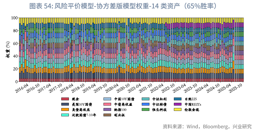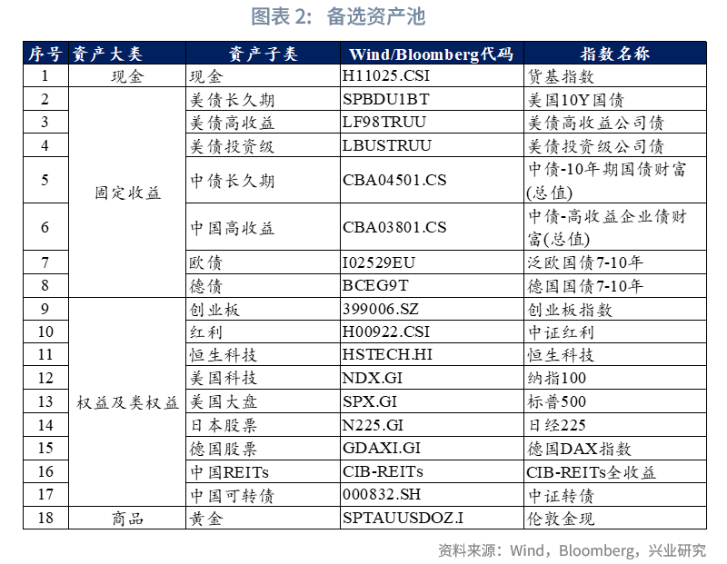 基于上述原则,最终初步选定18个子类资产,具体包括:(1)现金类:货基指数;(2)固定收益类:涵盖美债长久期、美债高收益、美债投资级、中债长久期、中国高收益、欧债、德债;(3)权益及类权益类:包含创业板、红利、恒生科技、美国科技、美国大盘、日本股票、德国股票、中国REITs、中国可转债;(4)商品:黄金。