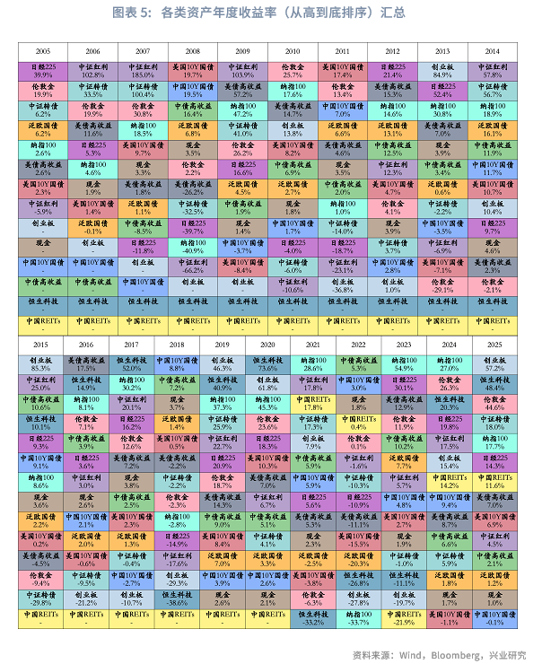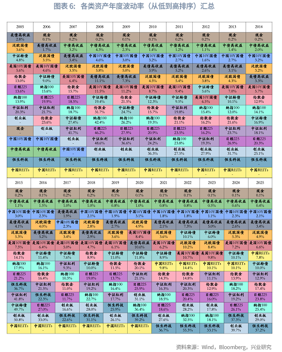 下面两个表展示了筛选后的14个资产子类在样本期内各年度的收益率与波动率情况(样本期内整体年化收益率、年化波动率、夏普比率见附录)。统计分析表明以下几点:(1)现金(货币基金)收益率排名靠前的年份(如2008年、2018年及2022年),通常对应大类资产配置难度较高的市场环境。该类资产表现突出,往往意味着其他大部分资产难以提供正收益,甚至多数出现负收益,从而突显其避险属性;(2)在上述市场环境复杂的年份中,中国10年期国债与中债高收益债券普遍表现优异,基本位列当年收益率前两位。