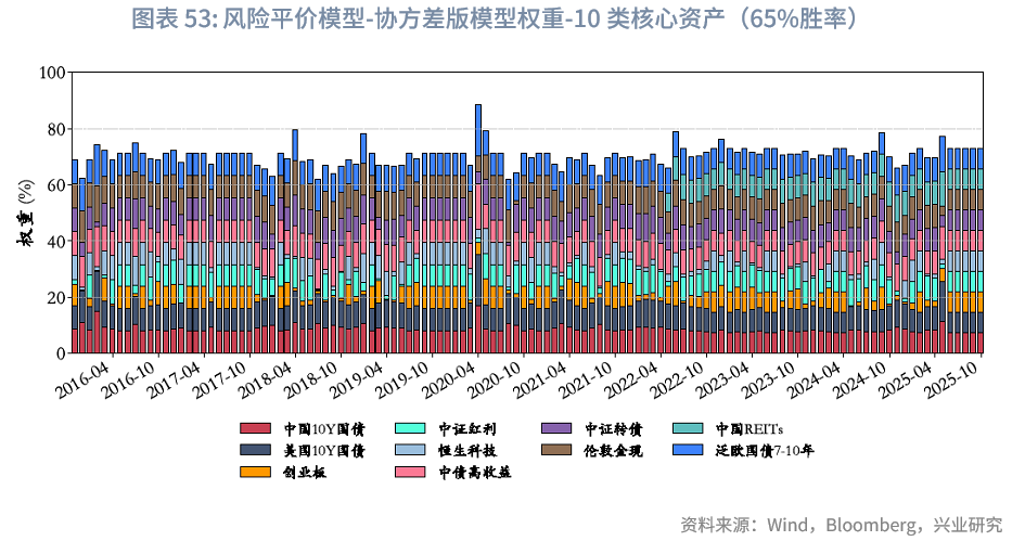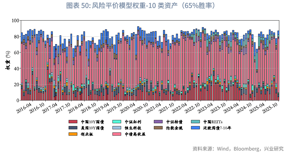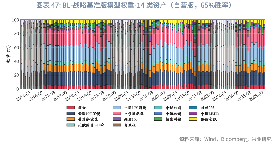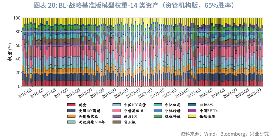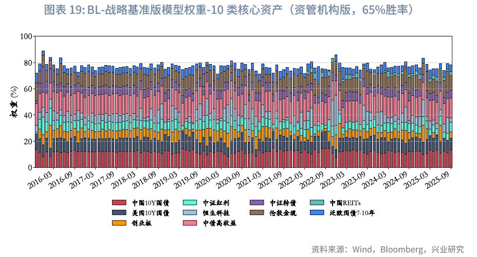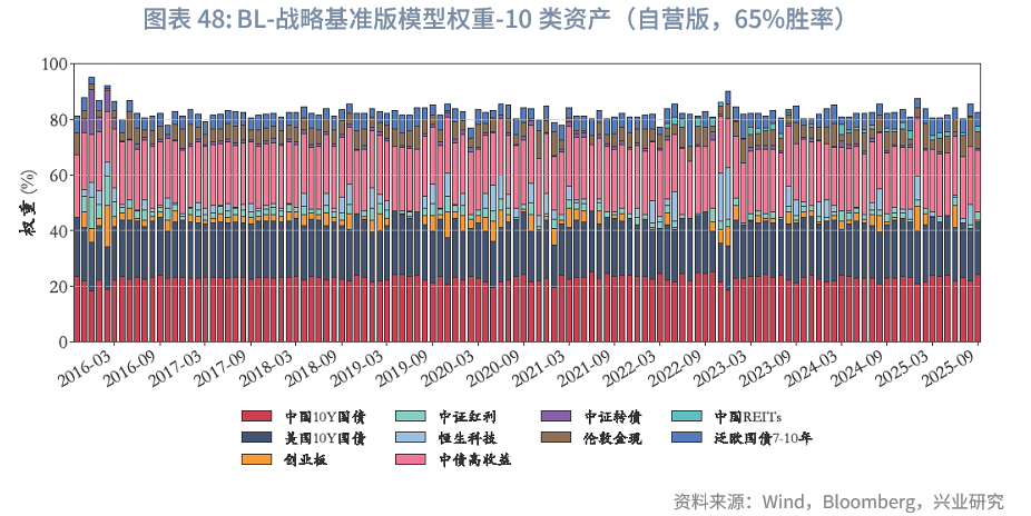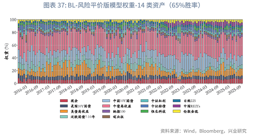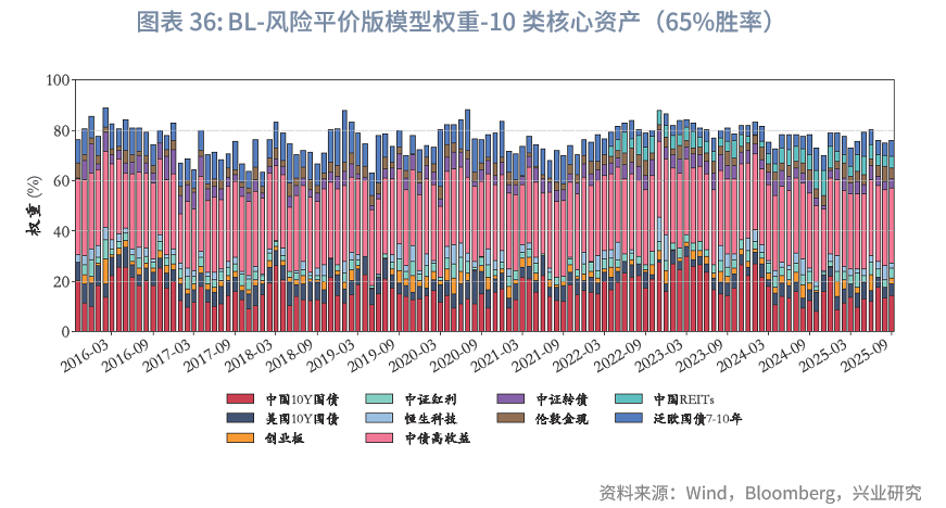 风险平价下的权重微调:与“BL-战略基准”模型不同,“BL-风险平价”模型未预设初始权重,而是由风险平价提供,且与“风险平价模型”中“纯风险等权”版本一致。在“BL-65%胜率-风险平价”下,在核心10类资产中,其整体平均权重之和约为84.6%,其中平均权重较高的几类资产依次为中债高收益、泛欧国债7-10年、中国10Y国债、美国10Y国债。固收类资产中,中债高收益、中国10Y国债、美债高收益、泛欧国债7-10年、美国10Y国债的平均权重分别为28.8%、17.2%、14.8%、10.3%、6.5%,整体固收资产权重总和为78%,与“风险平价-65%胜率”版本的86.4%存在差异,可能原因如下:(1)BL模型纳入主观观点采用贝叶斯思路,通过调整初始市场隐含均衡收益影响最优化求解,而风险平价模型则通过直接建立主观观点超额收益与波动率预期的映射进行调整,未纳入对观点不确定性的考量;(2)BL模型包含投资者风险厌恶系数、市场均衡信念等超参数,也会导致差异。两种模型纳入主观观点的方式难分绝对优劣,通常而言,风险平价的方式更主观直白,从主观观点到超额收益、波动率再到权重基本呈线性映射;而BL模型的兼容性则更强。