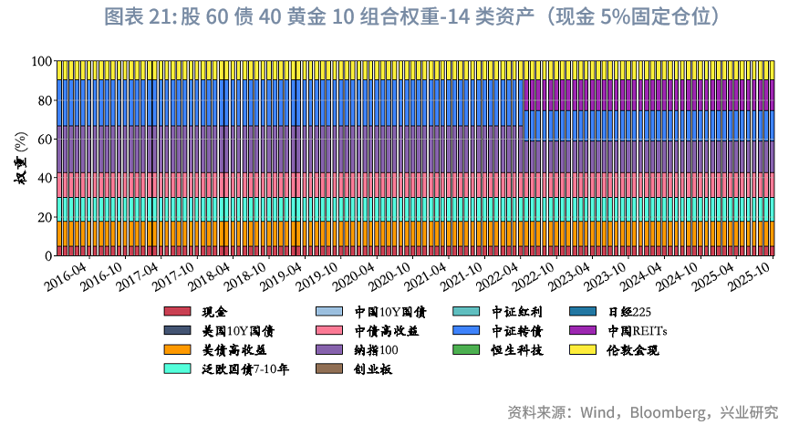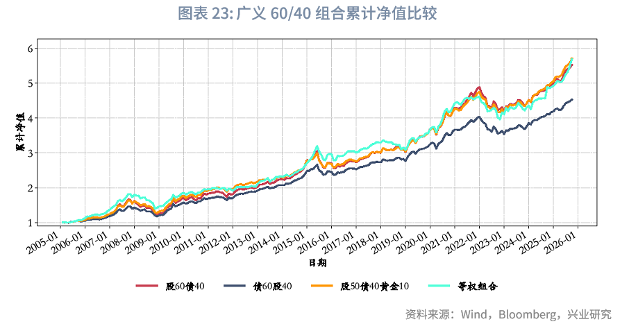 为了考虑流动性,我们设计了三个版本的广义60/40组合模型:(1)股60债40:固定现金仓位5%,95%可配置资产中股票占比60%、债券占比40%;(2)债60股40:固定现金仓位5%,95%可配置资产中债券占比60%、股票占比40%;(3)股50债40黄金10:固定现金仓位5%,95%可配置资产中股票占比50%、债券占比40%、黄金占比10%。