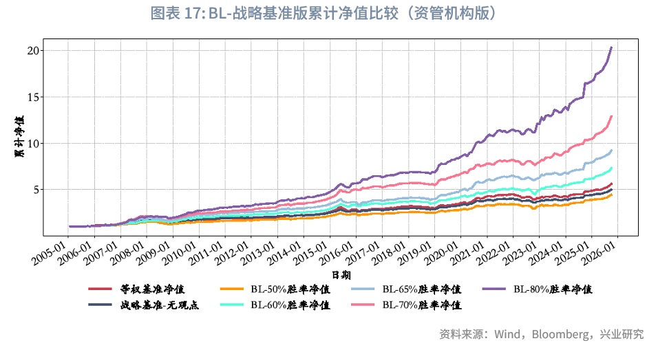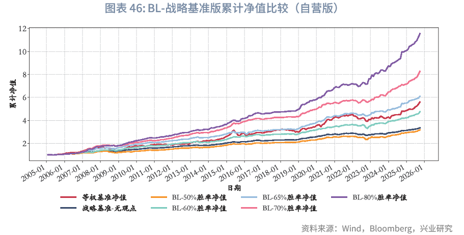 基准模型采用各类资产等权重配置。我们对比了“BL-战略基准版”的多个版本:无观点版(此处即战略基准配置)、生成主观观点版。其中,生成主观观点版的设置背景为:本研究仍以大类资产配置框架为核心,考虑到大类资产的主观观点获取难度较大,且即便可回溯,其样本期也相对较短,同时难以明确单个资产主观观点准确率达到何种水平时会产生显著超额收益。为此,我们设置了多个胜率水平:50%、60%、65%、70%、80%。