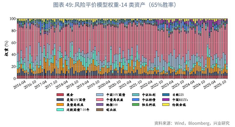 从波动表现最优的前两类组合来看:“风险平价-65%胜率”固收占比86.4%,现金占比5%;“BL-战略基准-自营-65%胜率”的固收类资产占比80%、现金占比5%;“BL-风险平价-65%胜率”与组合的固收类资产占比处于75%-78%区间(接近80%),现金占比同样为5%。其余组合的资产结构中固收类资产占比如下:“永久组合”的固收类资产与现金权重各为25%;“BL-战略基准-资管机构-65%胜率”的固收资产占比50%、现金占比8%;“广义60/40组合”(股票50%、债券40%、黄金10%)的固收类资产占比40%;“等权组合”的固收类资产合计占比约35.7%,同时配置5%现金。可见,上述组合的单年度最大回撤与年化波动率,基本与固收类资产占比呈负向关系,从附录“大类资产年化收益率和波动率”的数据中得到印证,其中现金年化波动率仅0.16%,中美高收益债及中国10年期国债的年化波动率亦控制在5.5%以内。