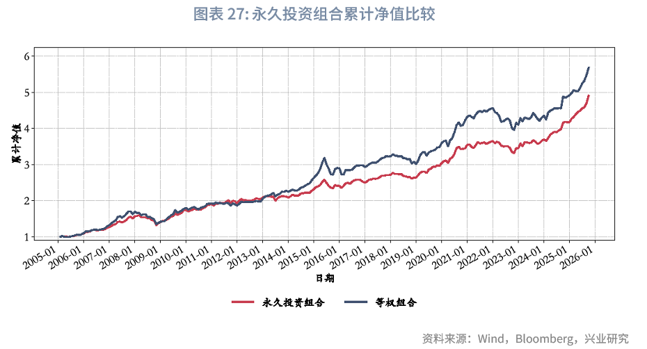 需要指出的是,60/40组合与永久投资组合并非期初完成资产配置后便持仓不动,而是遵循固定权重规则:例如某月度若某一资产出现超涨,这两类组合均会对该资产进行减配操作,从本质上看,这一调整逻辑也属于一种“再平衡”方案。