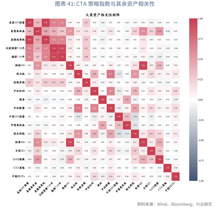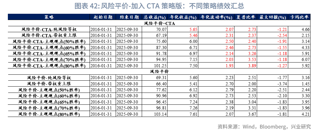 从相关性分析结果来看,CTA策略指数与多数资产呈负相关或低相关关系,其中与该指数相关性最高的资产为中国REITs,相关系数也仅为0.08。从组合表现来看,加入CTA策略后,组合波动显著降低,同时获得更高的夏普比率。与未加入CTA策略的基准组相比,在所有胜率场景下,加入CTA的风险平价模型波动率、最大回撤均有所下降,且夏普比率明显提升,这表明加入CTA策略在未显著牺牲收益的前提下,有效降低了组合波动。