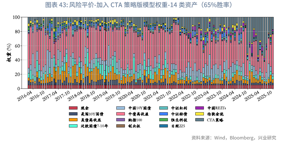 单年度最大回撤方面,由于样本期未覆盖2008年(通常是大类资产配置最大回撤年份)、2011年、2013年等其他大类资产配置表现较差的年份,故仅选取2020年、2022年(通常为其他大类资产配置表现第二、第三差的年份)进行对比。结果显示,相较于纯风险平价模型,加入CTA策略后,这两个年份的最大回撤减少超1%;若与其他模型相比,回撤降幅则更为显著。从风险平价模型给出的资产权重来看,CTA策略在整个回测期间的平均权重为13%,2022年之后其平均权重进一步提升至19.5%。