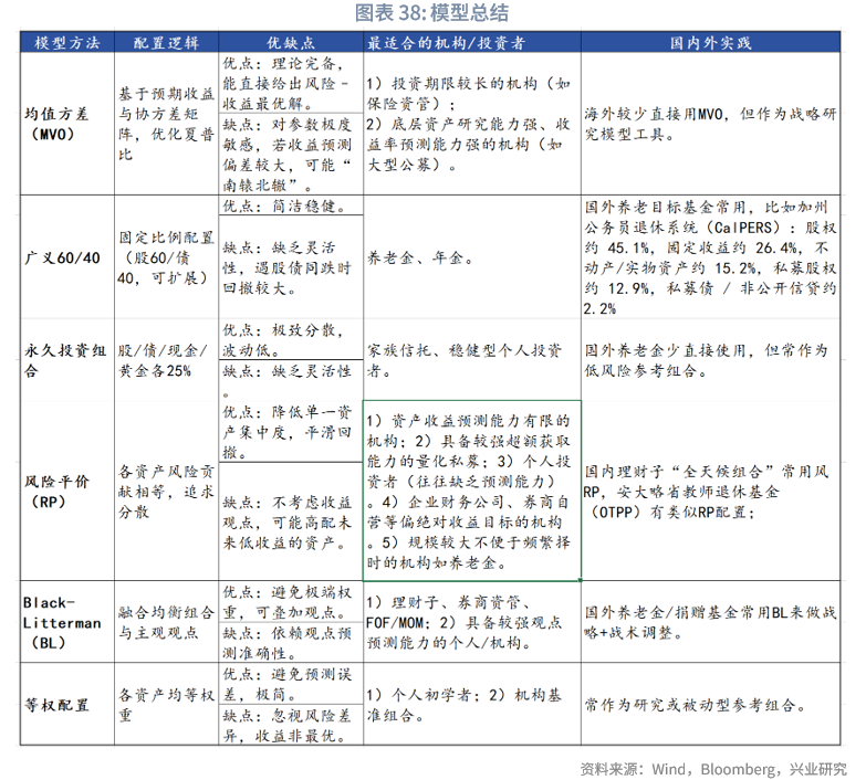 近年来受到广泛关注的风险平价,通过让各类资产在组合中贡献相等风险,实现风险来源的均衡化。其优点在于能够显著降低单一资产对组合的冲击,提高夏普比率,并在历史上展现出稳健的回撤控制能力。然而,该方法存在两方面局限:一是依赖杠杆提升收益,对衍生品与利率工具的使用要求较高;二是未显式纳入收益率预期,如果某一时期某类资产的预期收益偏低,风险平价仍可能给予其较高权重,从而导致潜在的机会成本。基于这些特点,风险平价更适合:1)追求稳健的养老金、银行理财子公司;2)具备较强单一资产超额获取能力的量化私募;3)缺乏预测能力的个人投资者;4)资金体量庞大、不支持高频择时的机构(如社保基金、养老金)。在国际实践中,美国俄亥俄州公务员退休系统(OPERS)和德州教师退休系统(TRS)均设有风险平价组合,富达投资(Fidelity)还专门推出了Risk Parity Fund。在中国,风险平价理念已逐步被理财子公司采纳,并常见于“全天候组合”的设计中。