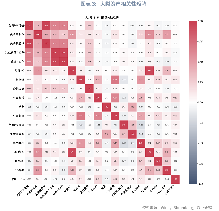 考虑到不同资产间可能存在较高相关性(从大类资产配置视角看具备较强替代性),因此本文在进入具体配置模型前,先通过相关性矩阵分析对上述初步确定的18类大类资产开展二次筛选,保留低相关资产,筛选结果如下:(1)在美国10年期国债与美债投资级两类资产中,最终选定美国10年期国债。二者相关系数达0.98,且美国10年期国债通常充当市场利率标杆,跟踪该资产的基金产品更为丰富,因此确定保留美国10年期国债指数;(2)纳指100与标普500指数的相关性为0.96,其中纳指100更能反映全球科技行业发展趋势,故本文选择纳指100作为配置标的,但在具体实践场景下,二者也可实现相互替代;(3)德债7-10年指数与泛欧国债7-10年指数的相关性达0.96,考虑到泛欧国债涵盖法国、意大利等多国国债,覆盖范围更广泛,本文选择泛欧国债7-10年指数;(4)日经225与德国DAX指数均代表非美发达国家资本市场,从与其余资产的相关性角度考量,日经225具备更强的分散配置价值,因此本文选定该指数。经上述筛选剔除后,最终剩余14个资产子类,分别为:现金、美国10年期国债、美债高收益、中国10年期国债、中债高收益、泛欧国债7-10年、创业板、中证红利、恒生科技、纳指100、日经225、中证转债、中国REITs、伦敦金现。