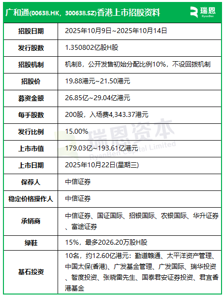 来自广东深圳南山区的A股上市公司、无线通信模组提供商广和通(00638.HK,300638.SZ),于今日(10月14日)起至周五(10月17日)招股,预计2025年10月22日在港交所挂牌上市,中信证券独家保荐。