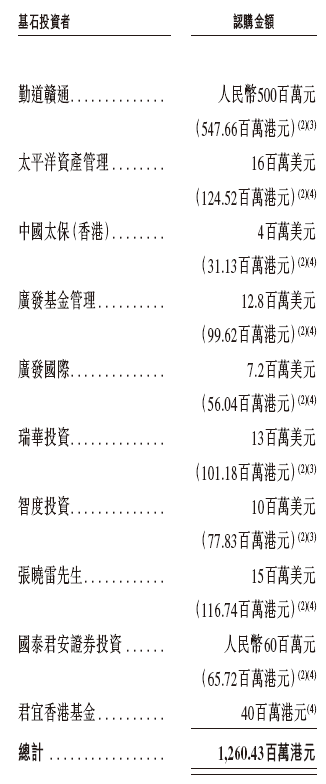 广和通是次IPO招股引入10名基石投资者,合共认购12.60亿港元的发售股份,基石投资者包括勤道资本及萍乡产业基金旗下勤道赣通认购人民币500万元,中国太保投资者包括太平洋资产管理、中国太保(香港)分别认购1600万美元、400万美元,广发基金管理及广发国际分别认购1280万美元、720万美元,瑞华投资认购1300万美元,智度股份(000676.SZ)通过智度投资认购1000万美元,张晓雷先生认购1500万美元,君宜(国泰海通掉期)、君宜香港基金分别认购人民币6000万元、4000万港元。