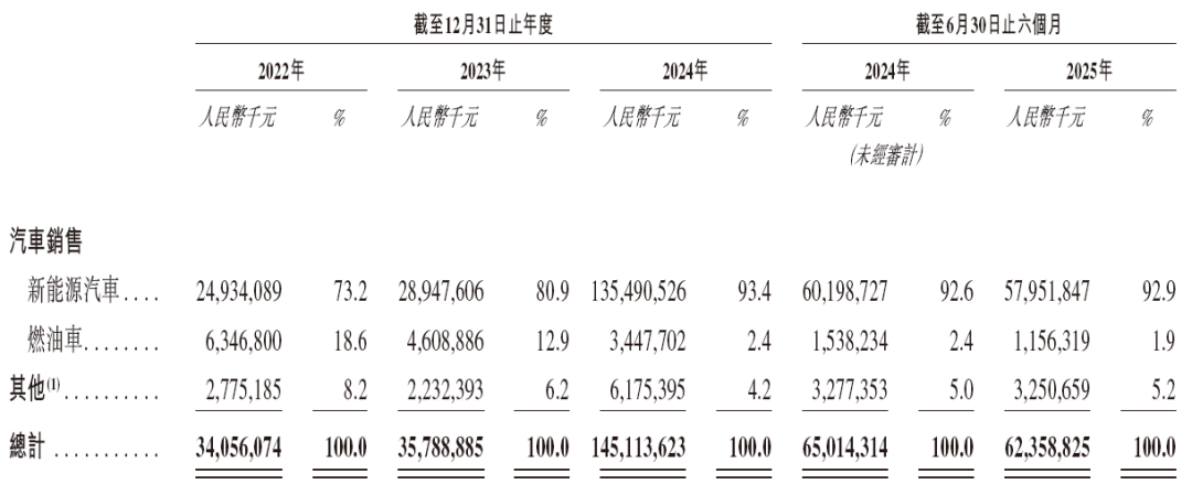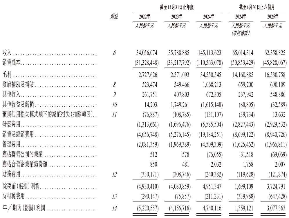 招股书显示,在过去的2022年、2023年、2024年和2025年前六个月,赛力斯的营业收入分别人民币340.56亿、357.89亿、1,451.14亿和623.59亿元,相应的净利润分别为人民币-52.21亿、-41.57亿、47.40亿和30.77元。