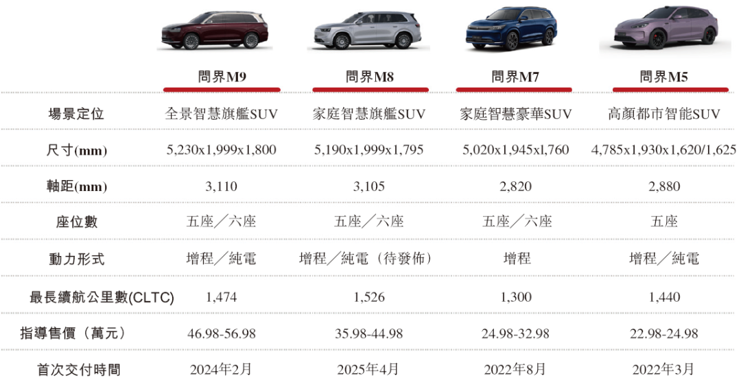 赛力斯的核心品牌问界自推出以来,旗下车型销量快速增长,颠覆了国内豪华车格局。截至目前,赛力斯已经成功推出问界M5、问界M7、问界M8和问界M9四款车型。其中问界M5创下上市当年新品牌单车交付量破万的最快纪录;问界M7成为中国市场30万元级最畅销自主品牌车型,2024年交付量约20万辆;问界M9则成为中国市场50万元级车型销量冠军,2024年交付量逾15万辆;赛力斯于2025年4月发布的问界M8,获市场追捧,正式上市后仅24小时大定即突破3万辆。