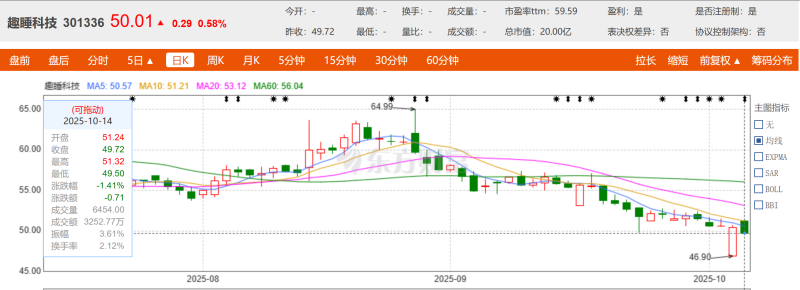 值得关注的是,上述转让价格是趣睡科技股东询价转让发送认购邀请书之日(即 2025 年 9 月 29 日,含当日)收盘价 51.82 元/股的84%。10月14日,趣睡科技股价报收49.72元,与上述转让价格仍存在折价。