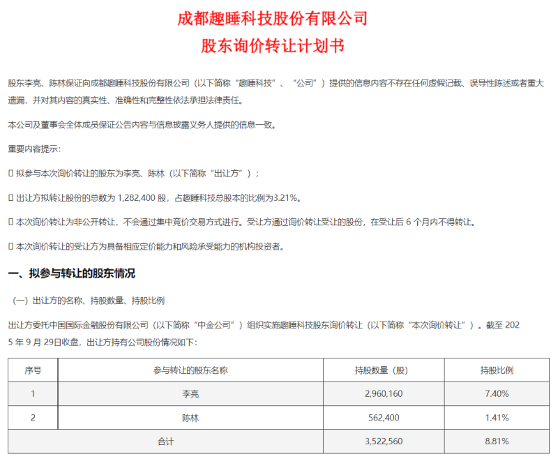 9月29日,趣睡科技发布公告披露,该公司的股东李亮(实际控制人一致行动人、持股5%以上股东、董事、高级管理人员)与陈林(实际控制人一致行动人)拟通过询价转让方式,合计转让128.24万股公司股份,占总股本的3.21%,占两人合计持股的36.41%。