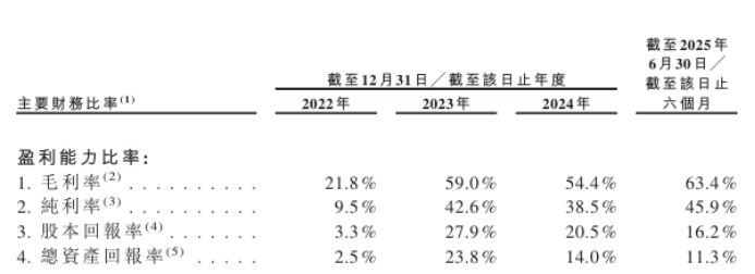 同一时期,公司实现营收分别为3123.6万元、1.09亿元、1.11亿元以及8454.2万元,2022年至2024年的复合年增长率约为89.0%;净利润298万元、4643万元、4288.4万元以及3882.3万元;毛利率分别为21.8%、59.0%、54.4%以及63.4%;纯利率分别为9.5%、42.6%、38.5%以及45.9%;股本回报率分别为3.3%、27.9%、20.5%以及16.2%,总资产回报率分别为2.5%、23.8%、14.0%以及11.3%。