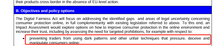 第一条的直译就是“ 防止商家使用暗黑模式和其他不公平手段,在网上对消费者施压、欺骗和操纵;”