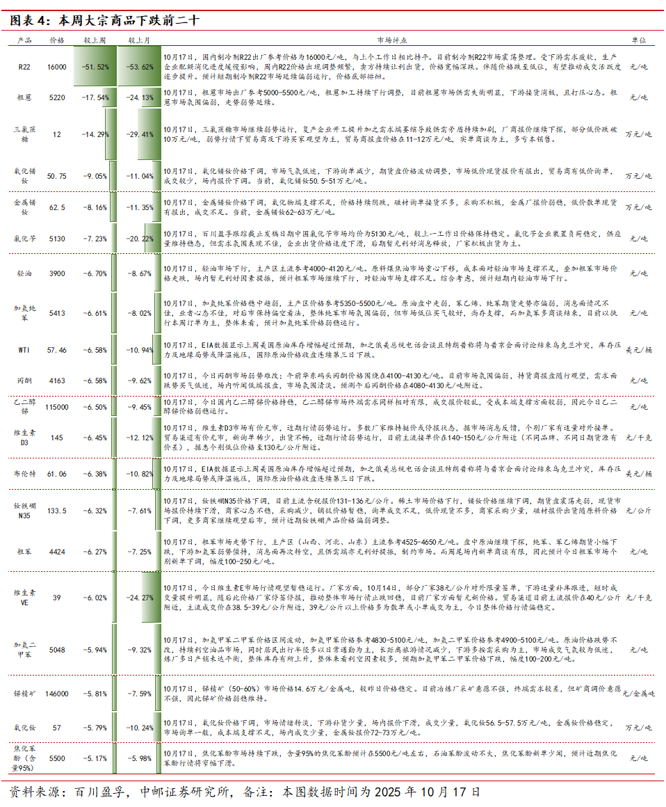本周大宗商品下跌前二十: R22(-51.52%)、粗蒽(-17.54%)、三氯蔗糖(-14.29%)、氧化镨钕(-9.05%)、金属镨钕(-8.16%)、氯化苄(-7.23%)、轻油(-6.70%)、加氢纯苯(-6.61%)、WTI(-6.58%)、丙酮(-6.58%)、乙二醇锑(-6.50%)、维生素D3(-6.45%)、布伦特(-6.38%)、钕铁硼N35(-6.32%)、粗苯(-6.27%)、维生素VE(-6.02%)、加氢二甲苯(-5.94%)、锑精矿(-5.81%)、氧化钕(-5.79%)、焦化苯酚(含量95%)(-5.17%)。