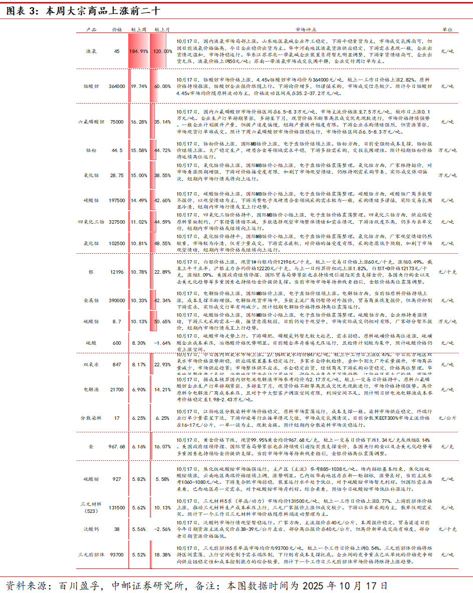 本周大宗商品上涨前二十:液氯(184.91%)、钴酸锂(19.74%)、六氟磷酸锂(16.28%)、钴粉(15.58%)、氧化钴(15.00%)、碳酸钴(14.49%)、四氧化三钴(11.02%)、氯化钴(10.81%)、银(10.78%)、金属钴(10.33%)、硫酸钴(10.13%)、硫酸(8.30%)、双氧水(8.17%)、电解液(6.90%)、分散染料(6.25%)、金(6.16%)、硫酸铵(5.82%)、三元材料(523)(5.62%)、泛酸钙(5.56%)、三元前驱体(5.52%)。