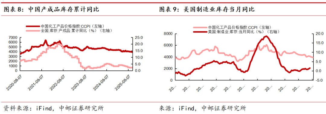 库存端,中美均处于累库阶段。2023年3月中国化工品库存增速达到近年高点,为10.7%。此后,行业主动去库存,累库速度放缓,2024年1-12月,中国产成品累计同比增速为3.3%。2025年1-6月,中国产成品累计同比增速为3.9%。2022年5月美国制造业库存增速达到近年高点,为11.30%。此后,美国进入主动去库存阶段,2023年10月-2024年2月美国制造业库存连续五个月出现负增长,2024年11月至2025年4月,美国制造业库存持续转正。