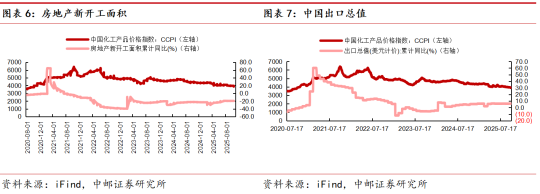 需求端,出口平稳,房产需求待增。中国房地产需求增速处于历史较低水平,2024年1月-12月,中国房地产累计新开工面积增速为-23%,2025年1-6月20日,中国房地产累计新开工面积增速为-22.80%;出口增速比较平稳,2024年1-12月,中国出口总值累计增速为+5.84%。2025年1-6月20日,中国出口总值累计增速为6%。我们预计伴随着国内房地产政策陆续出台、美国制造业PMI回升,中国内外需有望迎来改善。