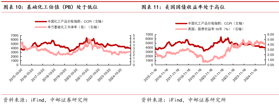 估值端,估值有望迎来提升。截止2025年10月17日,基础化工估值(PB)为1.98倍,处于2014年以来21.04%低分位,十年期美国国债收益率4.02%,处于2014年以来78.48%高分位,估值有望迎来提升。