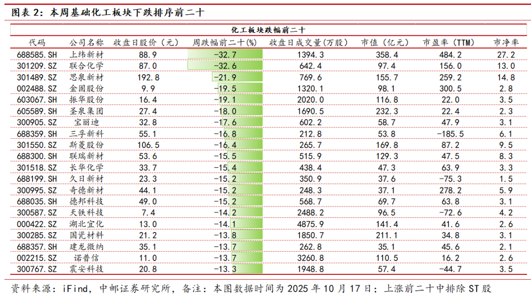 本周基础化工板块下跌排序前二十:上纬新材(-32.74%)、联合化学(-32.57%)、思泉新材(-21.90%)、金固股份(-19.53%)、振华股份(-19.06%)、圣泉集团(-18.04%)、宝丽迪(-17.64%)、三孚新科(-16.80%)、斯菱股份(-16.39%)、联瑞新材(-15.52%)、长华化学(-15.41%)、久日新材(-15.20%)、奇德新材(-15.19%)、德邦科技(-15.17%)、天铁科技(-14.20%)、湖北宜化(-14.09%)、国瓷材料(-13.80%)、建龙微纳(-13.74%)、诺普信(-13.67%)、震安科技(-13.34%)。