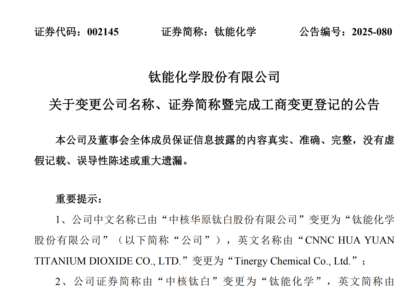 10月19日,中核钛白发布公告称,公司中文名称已由“中核华原钛白股份有限公司”变更为“钛能化学(维权)股份有限公司”,英文名称由“CNNC HUAYUANTITANIUM DIOXIDE CO., LTD.”变更为“Tinergy Chemical Co., Ltd.”;公司证券简称由“中核钛白”变更为“钛能化学”,英文简称由“CNNC TD”变更为“Ti Chem”,启用时间为 2025 年10 月20 日;公司证券代码“002145”保持不变。