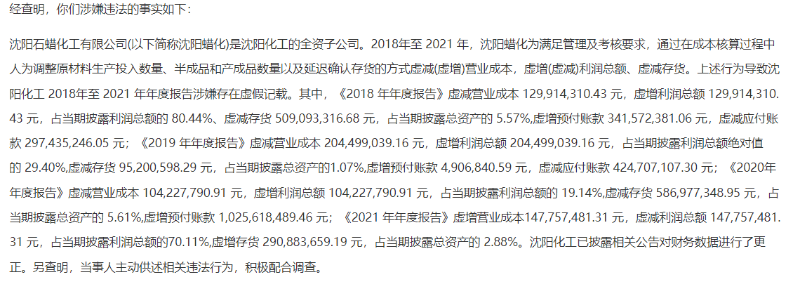 根据《事先告知书》发现,沈阳化工2018年至2021年年度报告涉嫌存在虚假记载,其主要为旗下子公司沈阳石蜡化工有限公司(简称“沈阳蜡化”)所致。