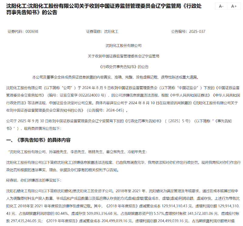 9月30日晚间,沈阳化工发布公告披露,该公司因财务造假被实施其他风险警示,即由“沈阳化工”变更为“ST沈化”。该公司收到辽宁证监局下发的《行政处罚事先告知书》(以下简称“《事先告知书》”),根据《事先告知书》,公司2018年至2021年连续四年财务造假。2024年8月,该公司因涉嫌信息披露违法违规,中国证监会决定对公司立案。