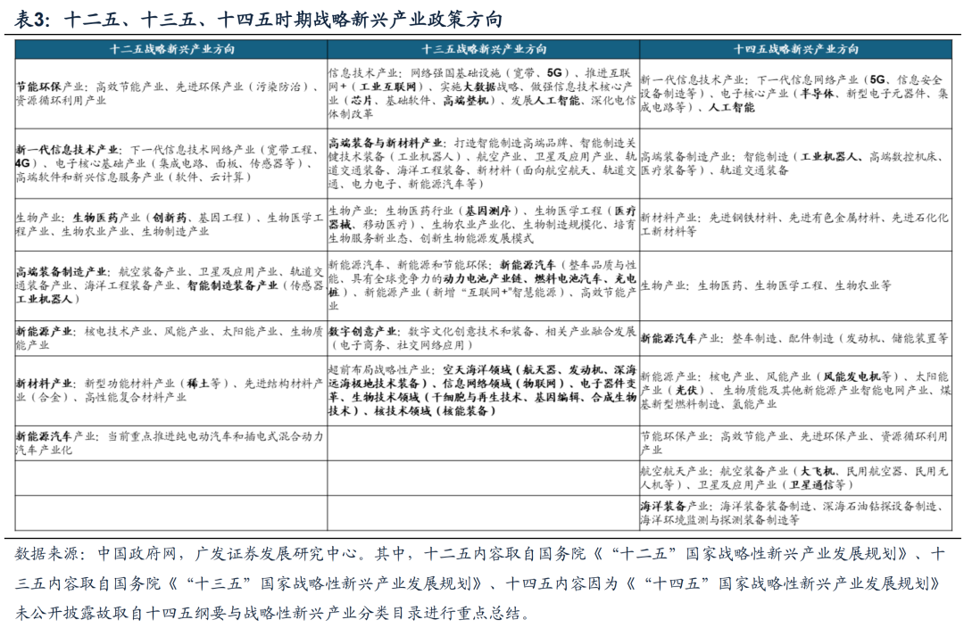 我们比对了十二五、十三五、十四五的战略新兴产业方向,三段期间政策重视度较高的板块分别是:十二五时期的生物医药;十三五时期的5G、动力电池;十四五时期的半导体、工业机器人、新能源与新能源车。