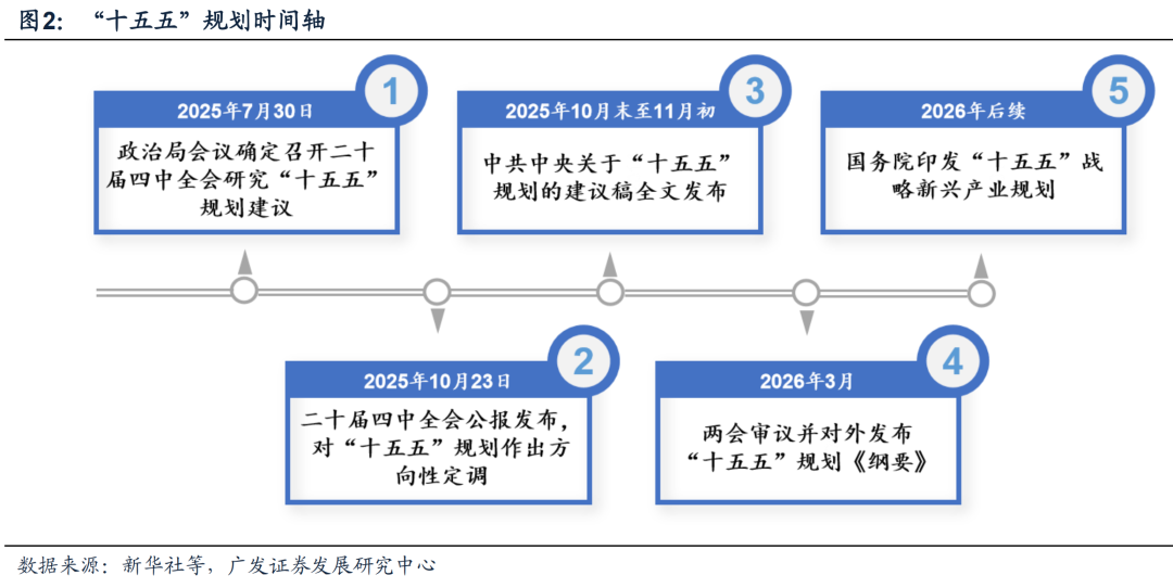 四中全会公报是中央对十五五规划的建议稿,而非完整的十五五规划全文,预计26年3月发布完整版《纲要》,里面会披露详细产业规划重点,除此之外,根据十三五、十四五配套战略新兴相关产业规划发布情况,明年还可能会发布十五五战略新兴产业相关规划配套文件,对十五五科技产业投资机会给出更加具象的指引。