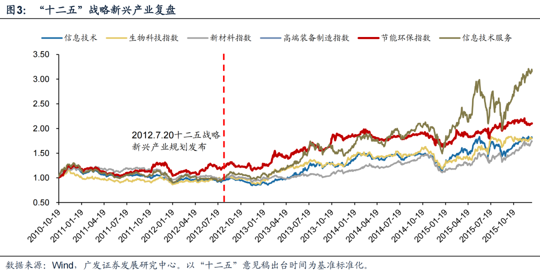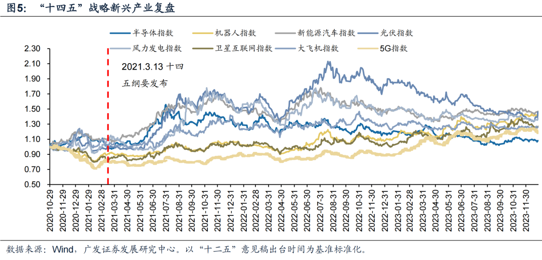 同时,我们筛选出五年规划期间重点战略新兴产业方向对应的三组Wind主题指数,并进行相对行情复盘,可以大致发现:拉长来看,板块间的分化非常可观,背后和政策扶持力度与产业趋势差异性相关。