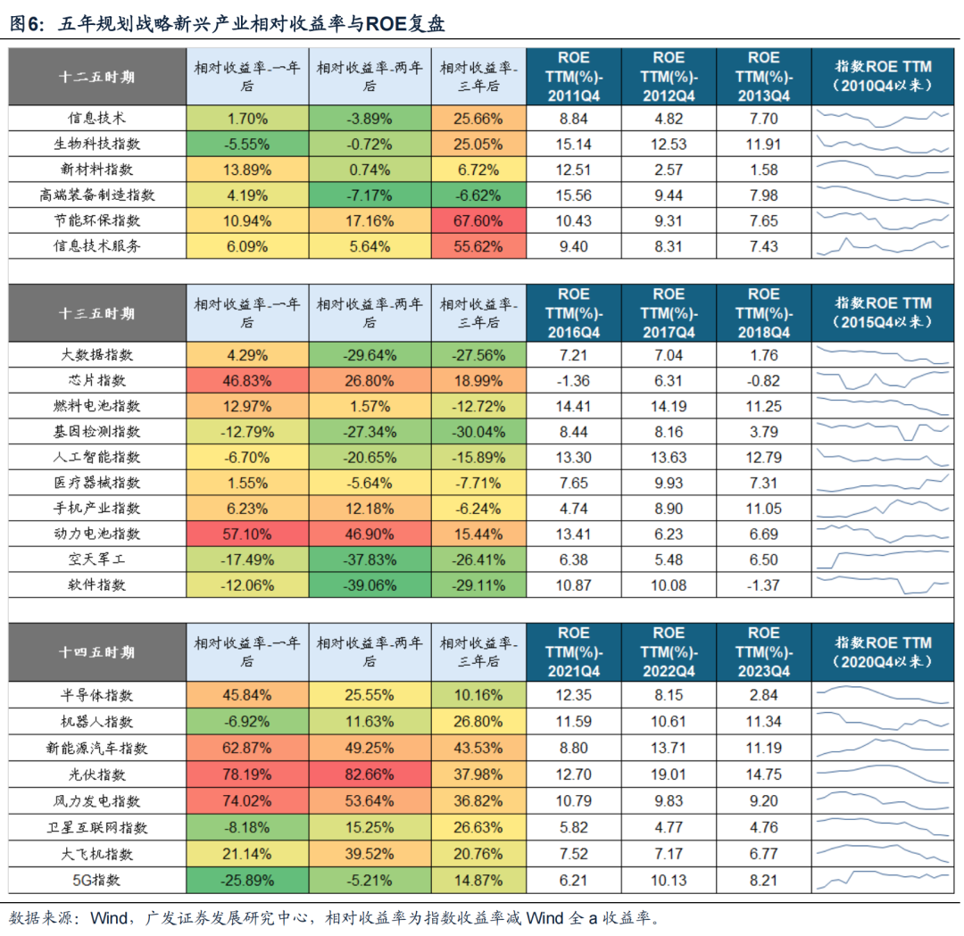 我们比对了十二五、十三五、十四五的战略新兴产业方向,并划定三段期间政策重视度较高的板块,比如十二五时期的生物医药;十三五时期的5G、动力电池;十四五时期的半导体、工业机器人、新能源与新能源车。