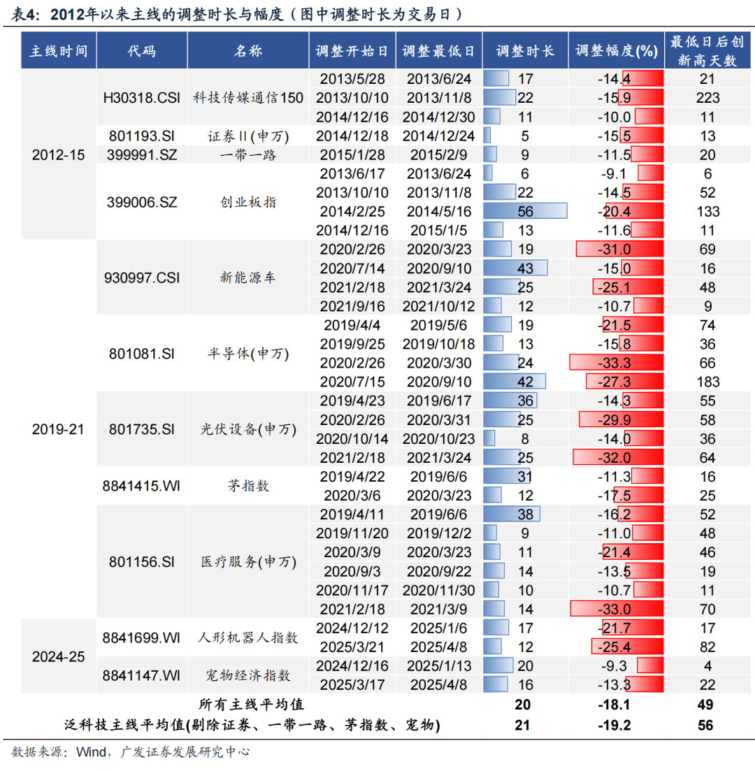 对于横盘主线,我们在《如何看科技调整:主线板块下跌时间、幅度复盘20251019》中有过详细的讨论,主要结论如下:①缓慢走弱/短期快速杀跌并不代表趋势的彻底结束,仅意味着趋势短期陷入横盘;②而产业趋势是决定主线横盘后能否创新高的根本;③横盘时,历史主线平均调整时长为21日,平均调整幅度为19.2%;④对于横盘主线,我们认为行情尚未终结,后续仍有新高可能(产业趋势仍存+TACO交易)。