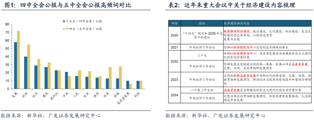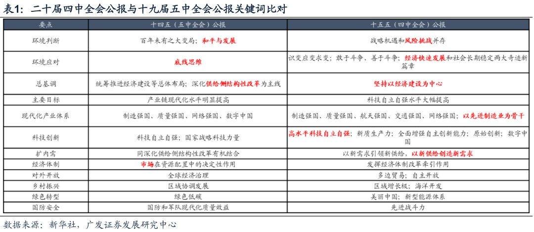 10月23日,二十届四中全会顺利召开并发布公报展望“十五五”规划,我们比对了十九届五中全会通稿(对应“十四五”规划指引),发现本次公报一个最直接的变化是:“坚持以经济建设为中心”的表述再次回归,这一词汇上次出现在重要会议,还要追溯到2022年的二十大报告。