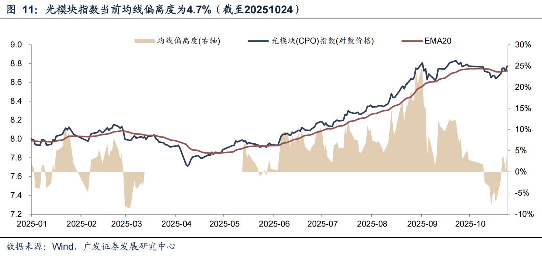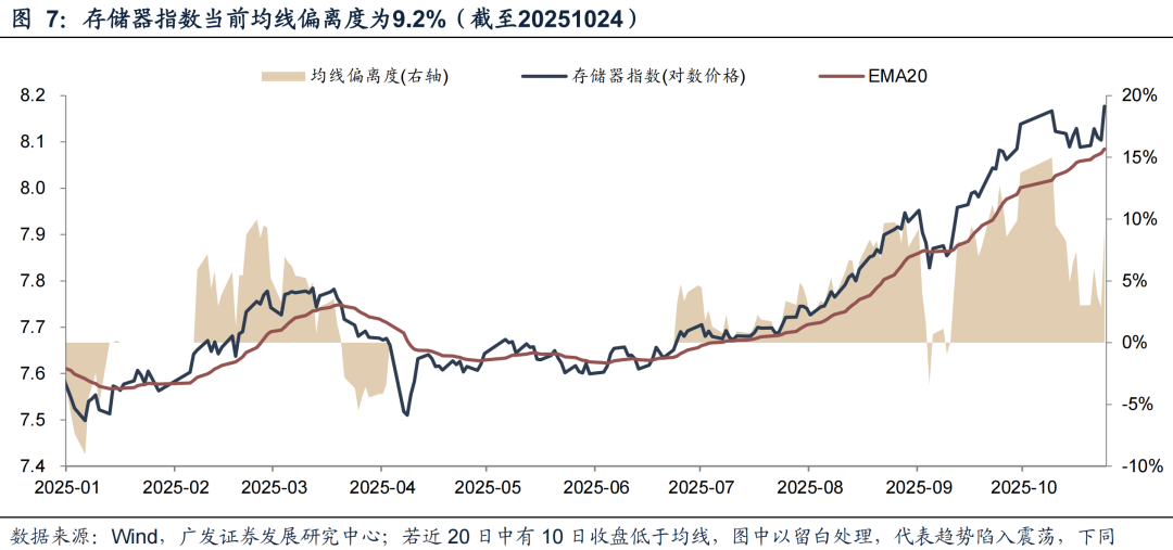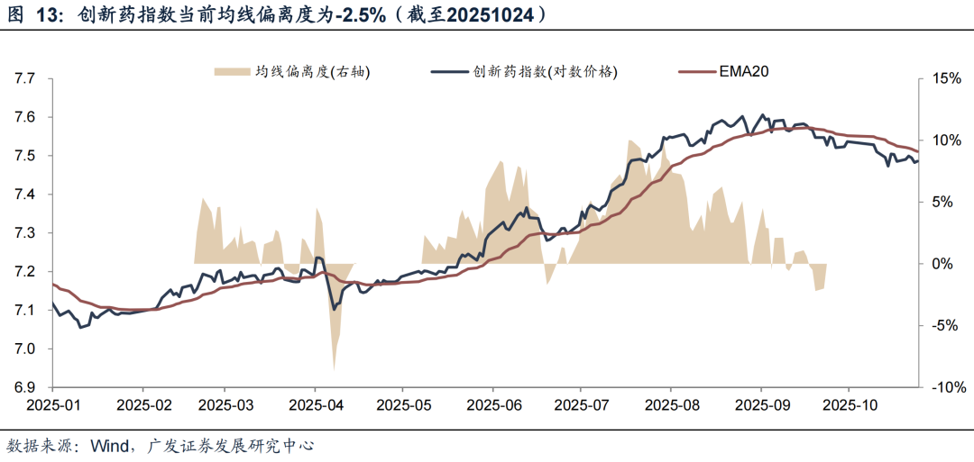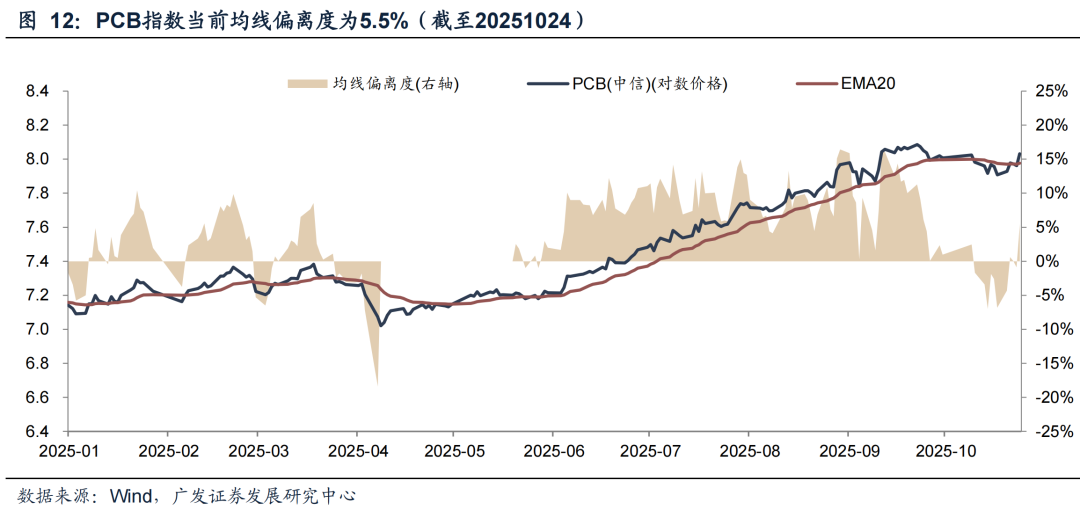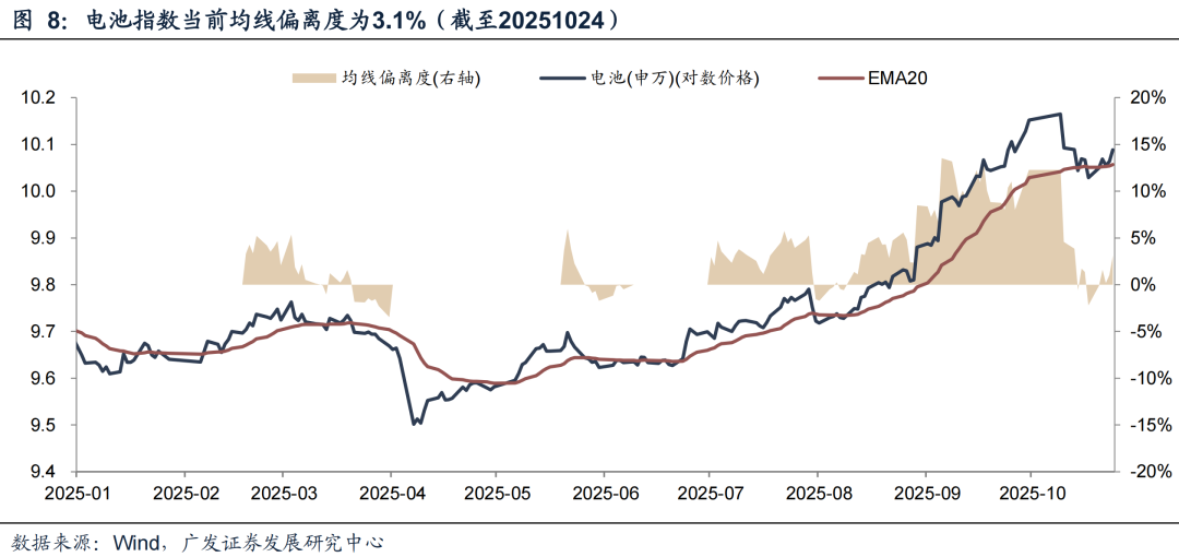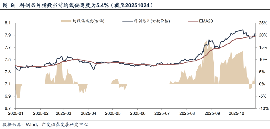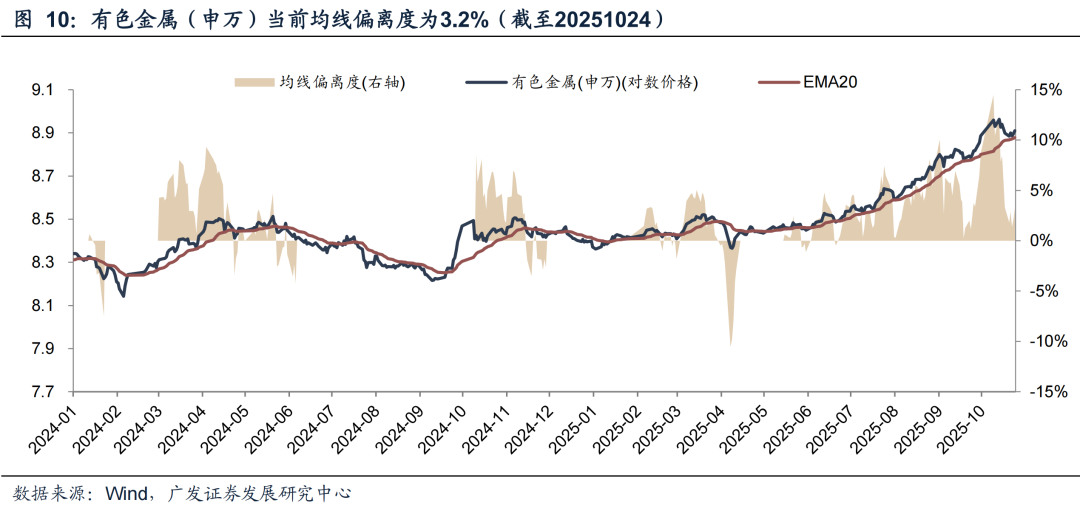 我们在周报《如何区分主线是调整还是终结?20250914》中提出均线偏离度指标,以衡量主线行情趋势的强弱:均线偏离度=ln(Close)-ln(ema20),数值近似代表偏离百分比。