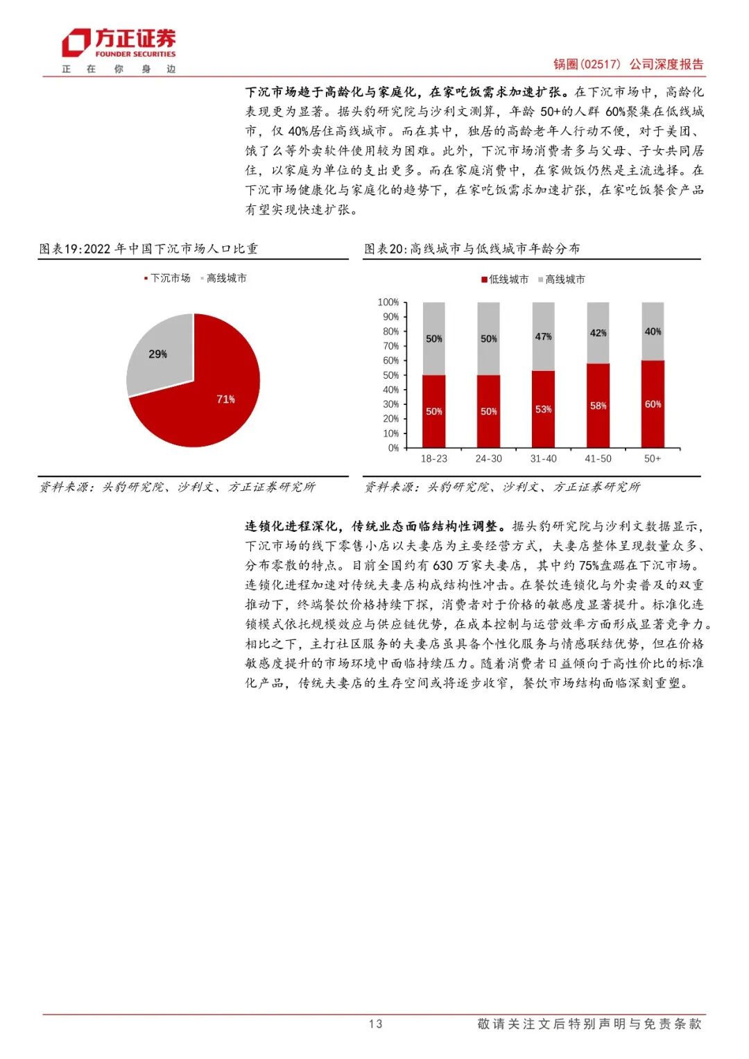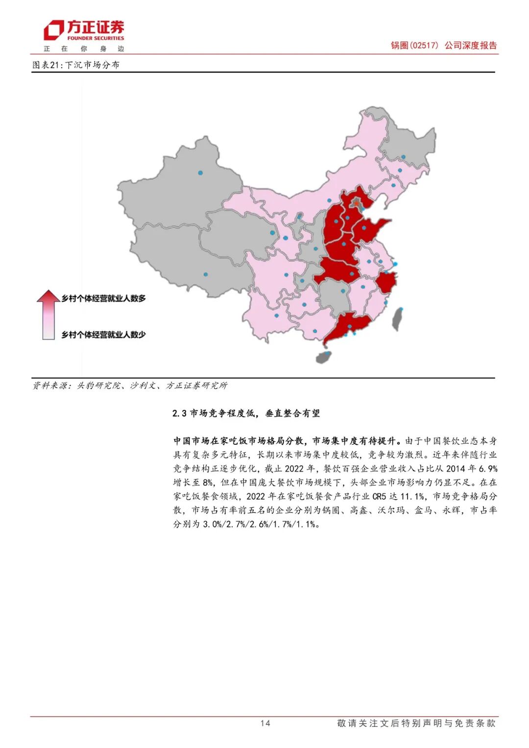 行业空间持续拓宽,未来增长支点已现。在家吃饭市场需求表现强劲,市场空间持续拓宽。伴随上游食品制造工艺的不断成熟,终端冷链配送的技术愈发完善,懒人经济的不断兴起,市场需求加速扩张。其中,下沉市场需求强劲,市场竞争程度低,伴随连锁化进程的加剧,产业链加速整合,在家吃饭餐企有望实现进一步整合,市场集中度有望提升。