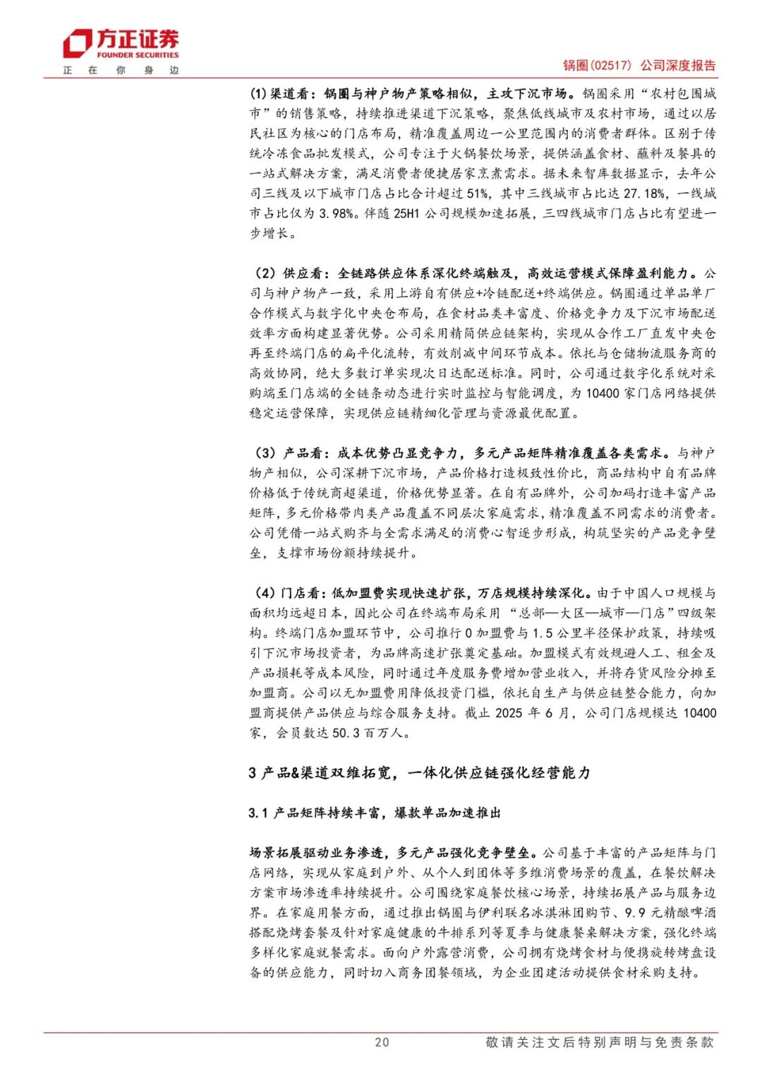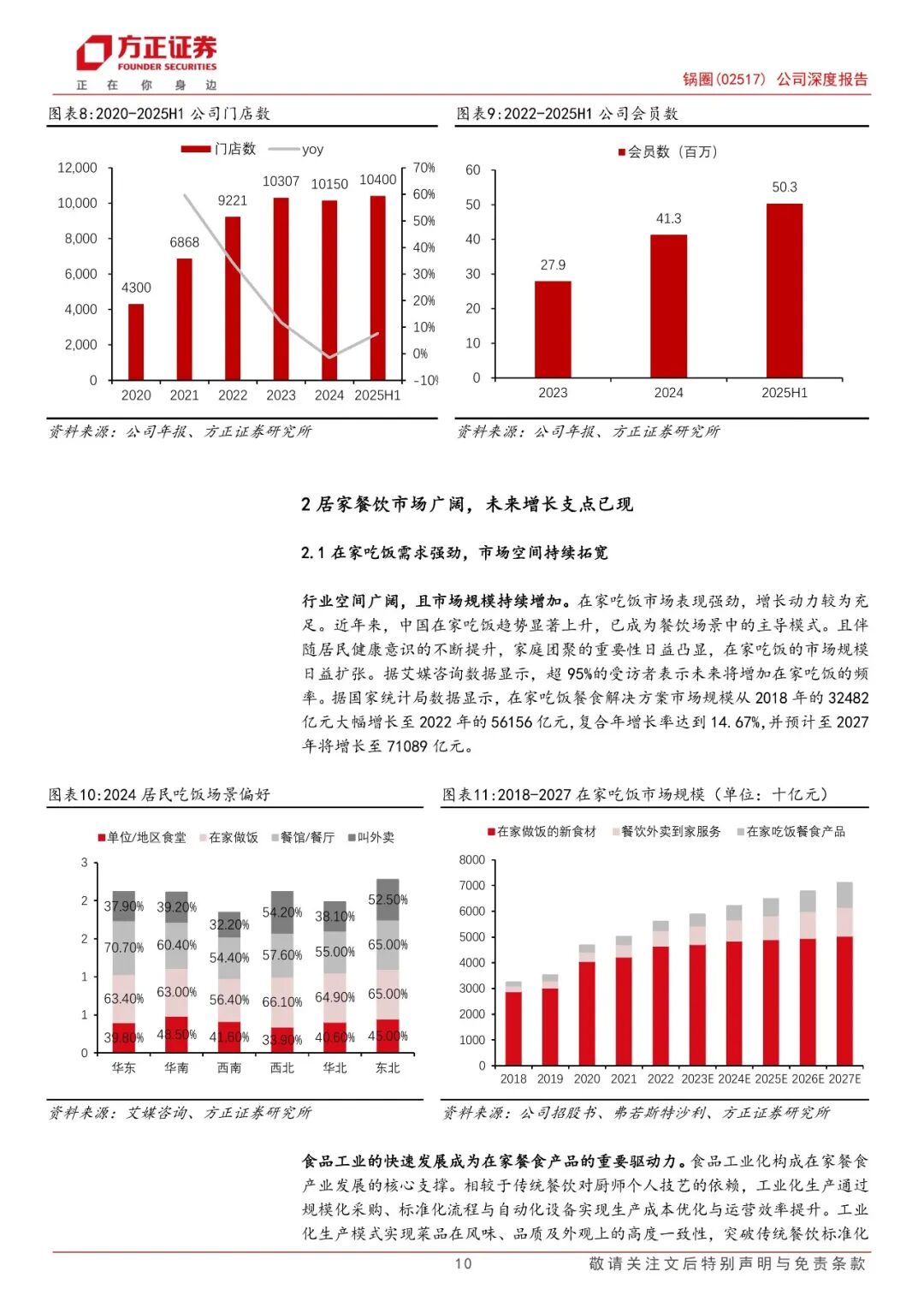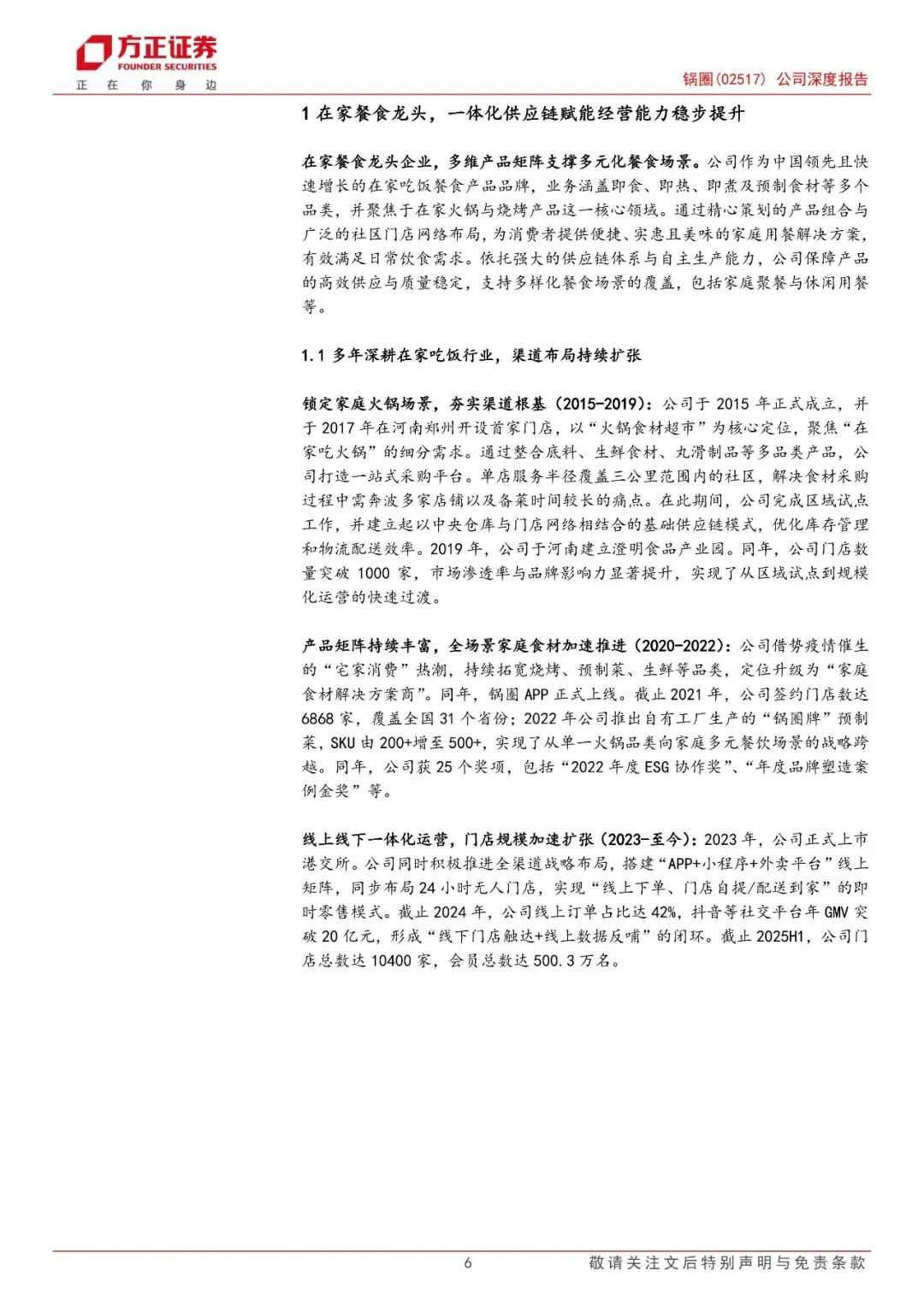聚焦家庭餐饮场景,供应链与渠道协同扩张。公司作为中国在家吃饭餐食解决方案的领先企业,自成立以来深耕家庭火锅与烧烤核心领域,并凭借多元化产品组合与广泛的社区门店网络实现业务快速成长。依托一体化供应链体系与自主生产能力,公司保障产品的高效供应与品质稳定,构建了从原料采购到终端销售的全链条管控能力。终端渠道网络持续深化,会员粘性持续提升。截止2025H1,公司门店总数已达10400家,会员规模达50.3百万名。