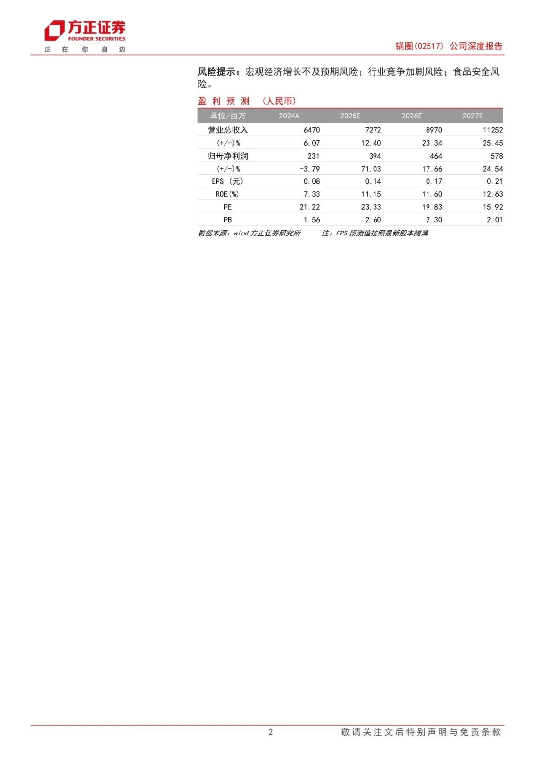 盈利预测:我们认为,锅圈深耕下沉市场,多元化布局叠加“单品单厂”的策略,一体化生产筑基高效运营能力护城河。公司凭借“产品+渠道”双维拓宽,产品矩阵持续丰富,下游产品维持高性价比策略,在经济弱复苏与餐饮行业竞争不断加剧的背景下,公司优势显著;叠加公司门店规模持续扩张,单店模型加速优化,门店坪效稳中有进,公司龙头地位稳固,垂直整合有望。预计公司25-27年实现营业总收入72.72/89.70/112.52亿元,核心经营利润3.94/4.64/5.78亿元,PE分别为23.33/19.83/15.92x。绝味食品、巴比食品与味知香均为连锁加盟模式,均与公司有相似之处。因此我们选取绝味食品、味知香、巴比食品作为可比公司进行估值比较,公司估值低于可比公司均值,维持“强烈推荐”评级。