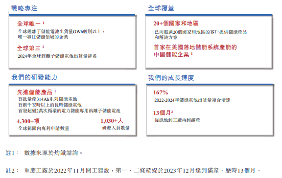 根据灼识咨询,于2024年,海辰储能的锂离子储能电池出货量位居全球第三,市场份额11%。2024年储能电池出货量达到35.1GWh,2022-2024年的年复合增速达到167%。于2025年前六个月出货量达30.0GWh,同比增长252.9%。