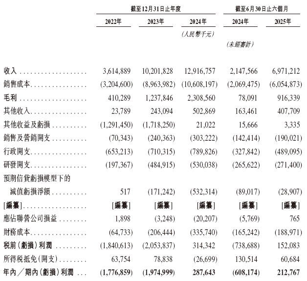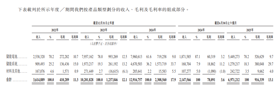 招股书显示,在过去的2022年、2023年、2024年和2025年前六个月,海辰储能的营业收入分别人民币36.15亿、102.02亿、129.17亿和69.71亿元,相应的净利润分别为人民币-17.77亿、-19.75亿、2.88亿和2.13亿元,相应的经调整净利润分别为人民币-1.05亿、-2.25亿、3.18亿和2.47亿元。