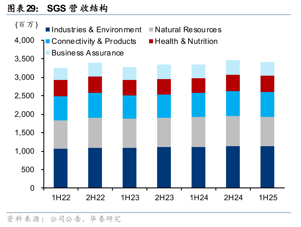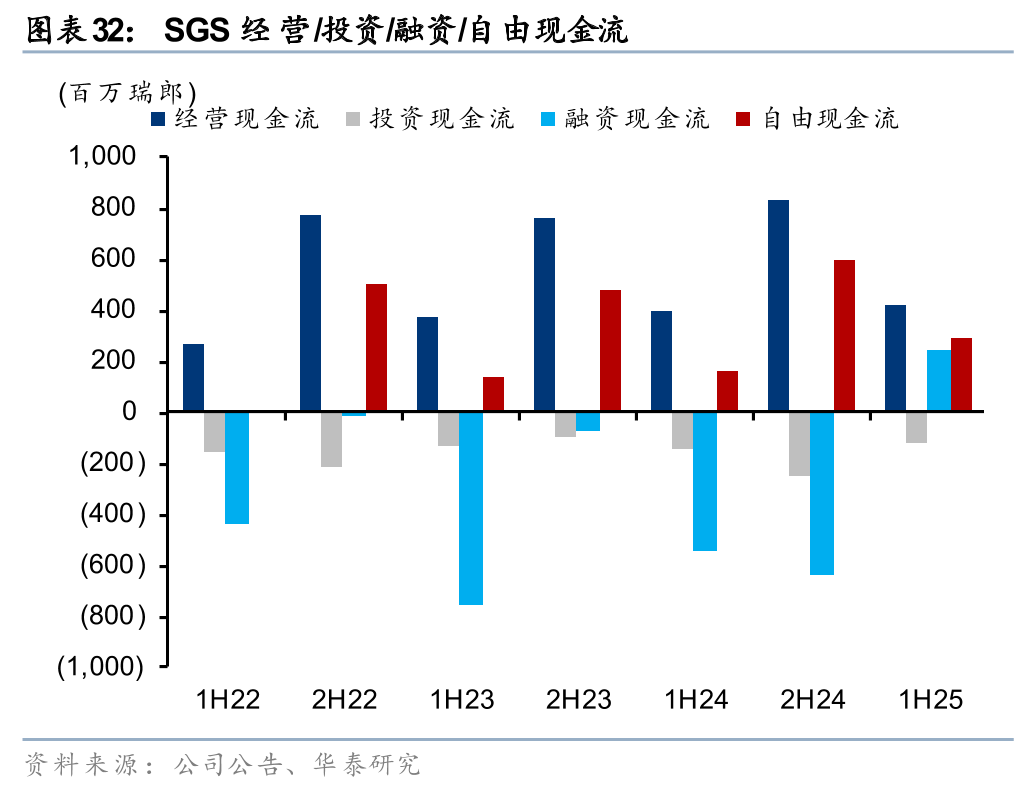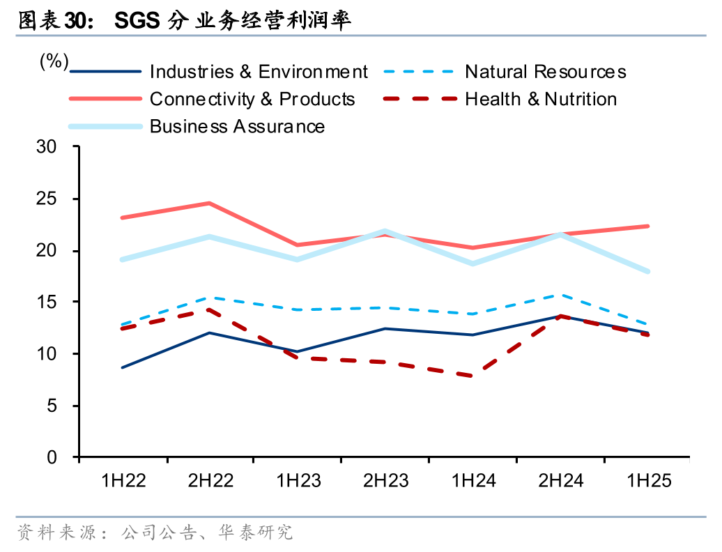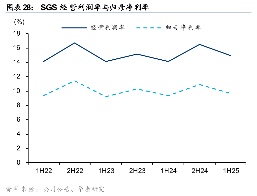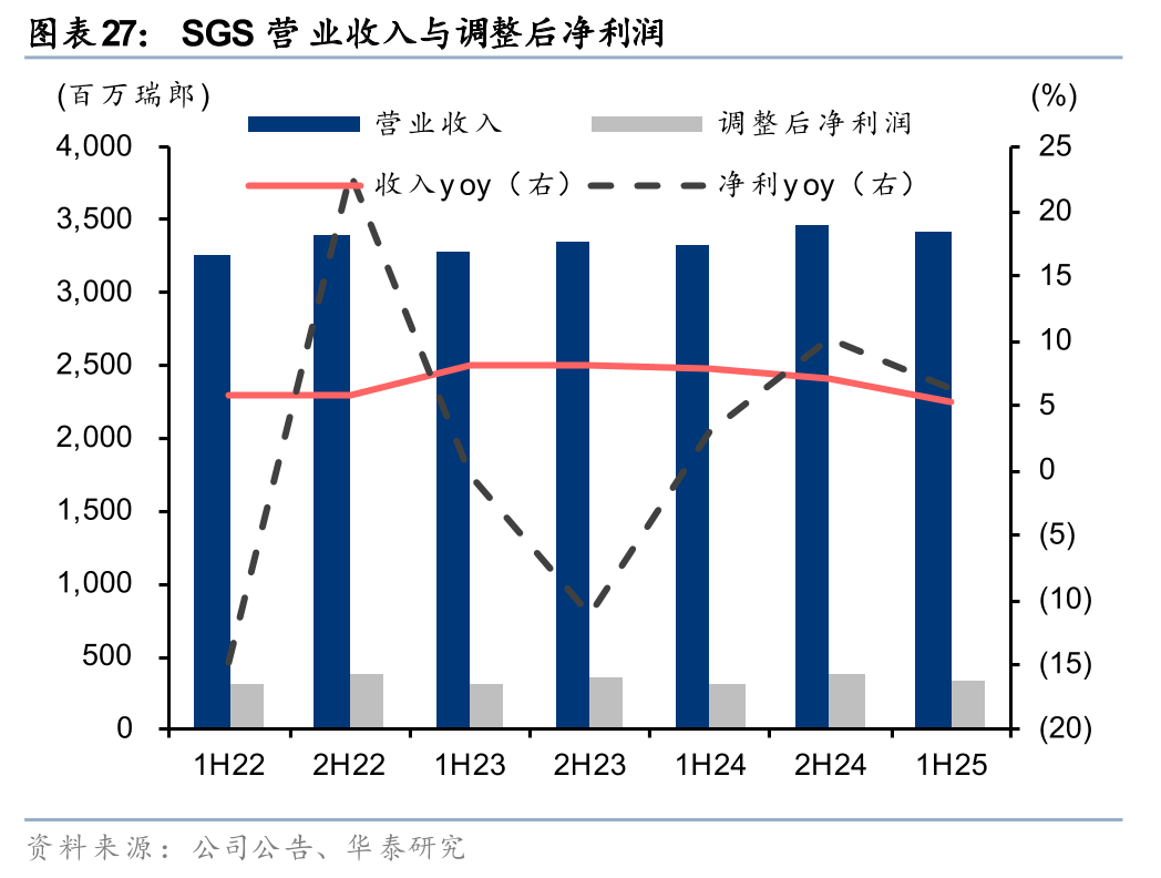 SGS(瑞士):稳健增长的 “检测茅”。SGS作为全球最大的检验检测机构,1H25实现营收34.22亿瑞郎(约合38.2亿美元),同比增长2.6%,剔除汇率波动影响后内生增速达5.3%。分区域看,亚太、欧洲两大基本盘营收分别为11.24亿、11.27亿瑞郎,同比-1%、+2%;北美市场营收4.58亿瑞郎,同比增长14%,随着ATS并购推进有望加速扩张;拉丁美洲增速达35%,展现强劲增长动能。分业务看,高毛利的Business Assurance(商业认证)业务营收3.80亿瑞郎,同比增长4%,调整后经营利润率为17.9%;Testing & Inspection(检测与检验)业务中,Connectivity & Products板块表现突出,营收6.72亿瑞郎,同比增长4%,调整后经营利润率提升2.1pp至22.3%,为各业务板块最高。盈利质量方面,1H25调整后经营利润率同比提升0.8pp至14.9%,调整后净利润3.31亿瑞郎,同比增长6%;自由现金流达2.88亿瑞郎,同比增长86%。