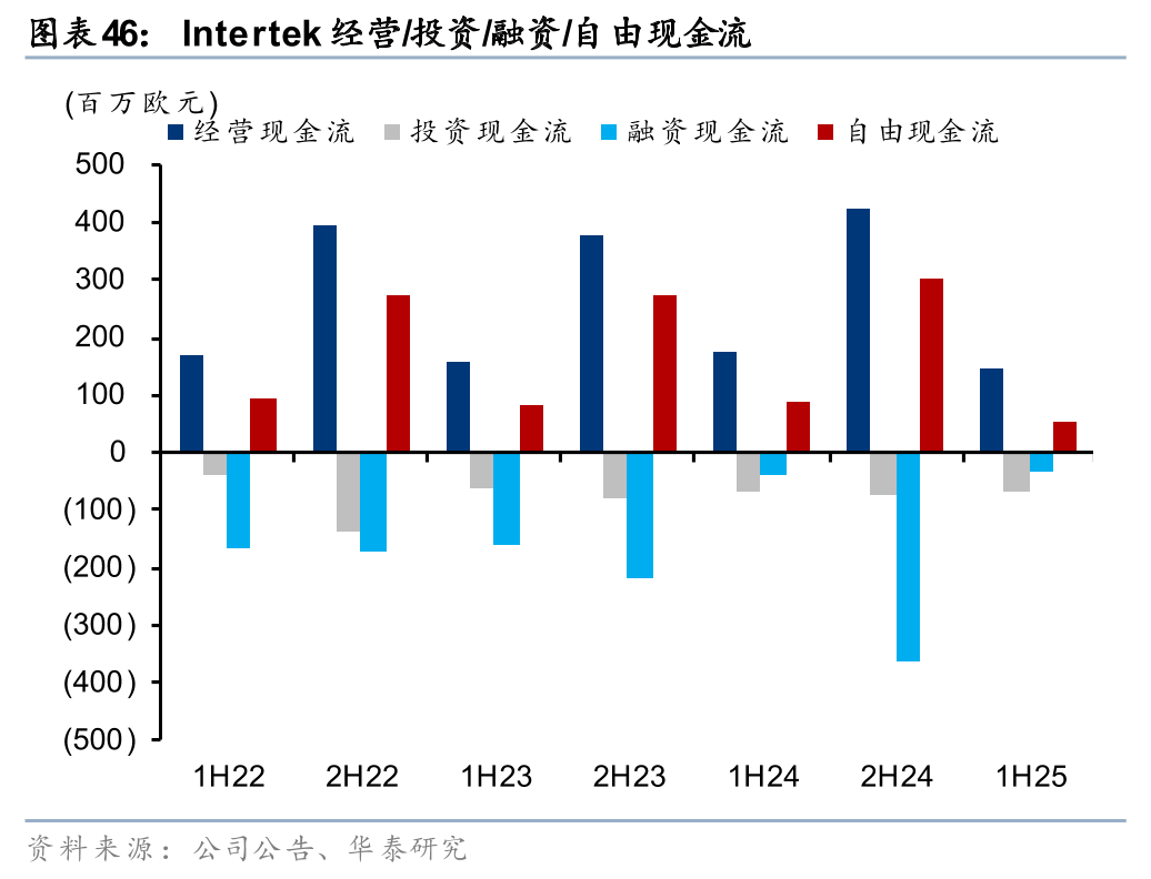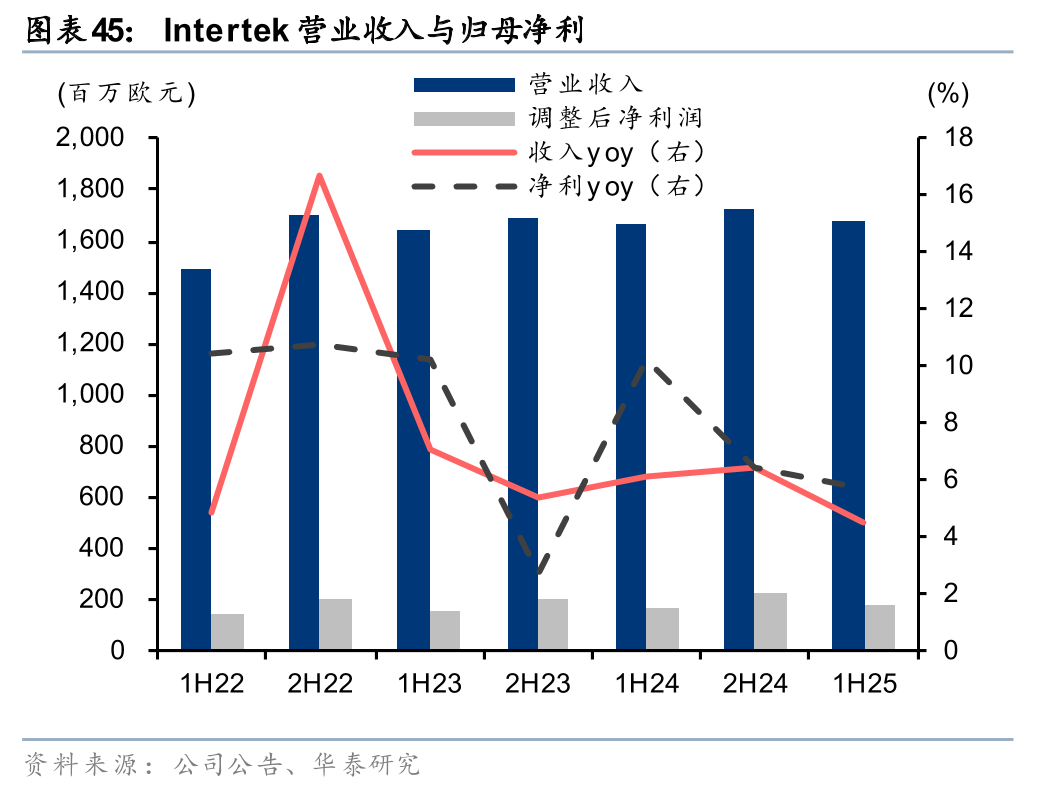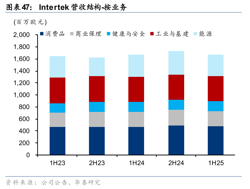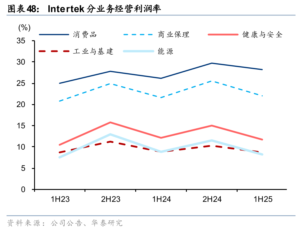 Intertek(英国):全球消费品检测领军者。Intertek(天祥集团)1H25延续稳健增长态势,实现营收16.73亿英镑,同比增长0.2%,剔除汇率影响后内生增速达4.5%;经营利润达2.76亿英镑,同比增长4.2%(剔除汇率因素后增长9.7%),经营利润率提升60bps至16.5%(剔除汇率因素后提升80bps),EPS同比增长6.3%(剔除汇率因素后实现12.6%的双位数增长),连续9个半年实现MSD LFL营收增长、连续5个半年实现DD earnings增长。分业务看,核心增长引擎表现突出:消费品检测业务(World of Consumer Products)LFL增长7.9%,其中电子电器检测受益于智能设备与IoT认证需求,收入保持高单位数增长;Corporate Assurance业务LFL增长8.2%,ISO标准升级与企业ESG风险管控需求推动业务放量,贡献显著增量。工业品检测领域,新能源汽车零部件检测持续高增,建筑材料检测受益于北美市场并购标的并表实现稳健增长。财务健康度方面,H1现金转化率达118%,调整后自由现金流为5600万英镑;中期股息同比增长6.3%至57.3p/股,分红政策稳健、保持65% 派息率。