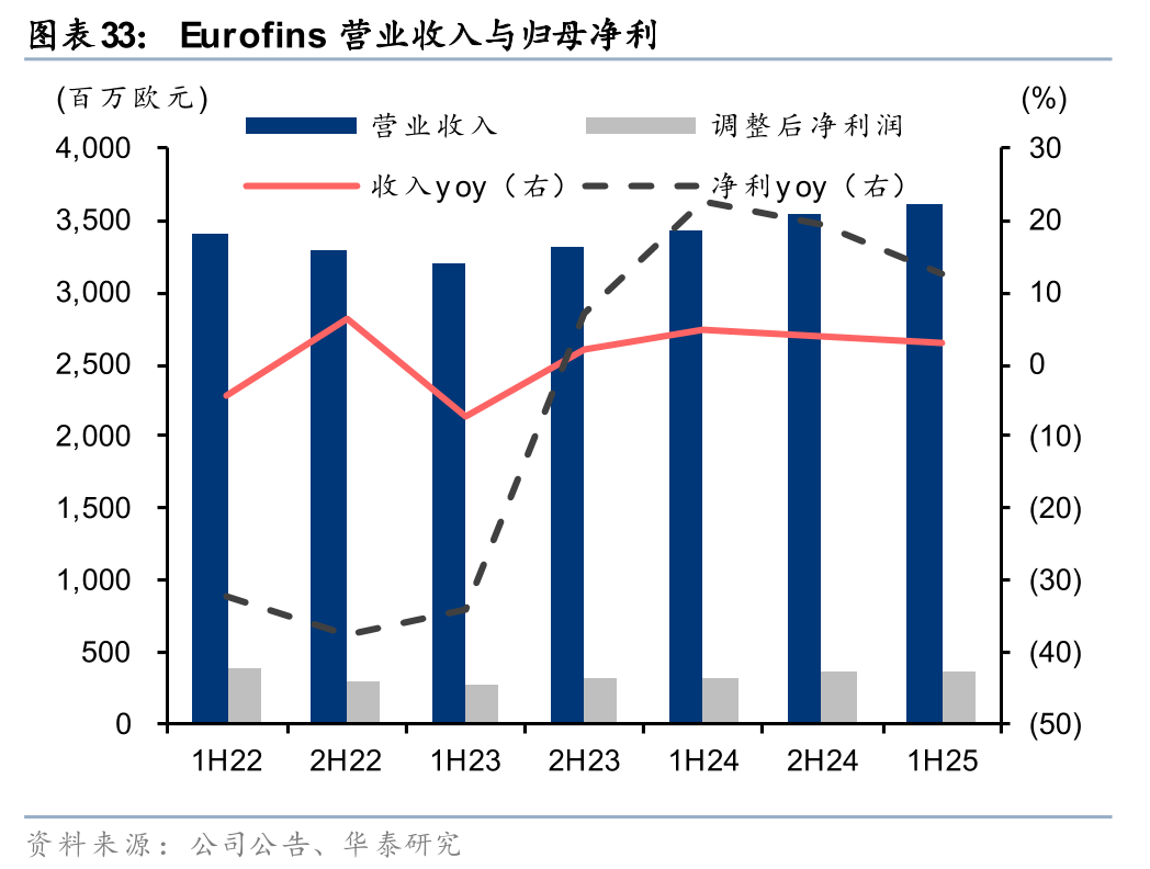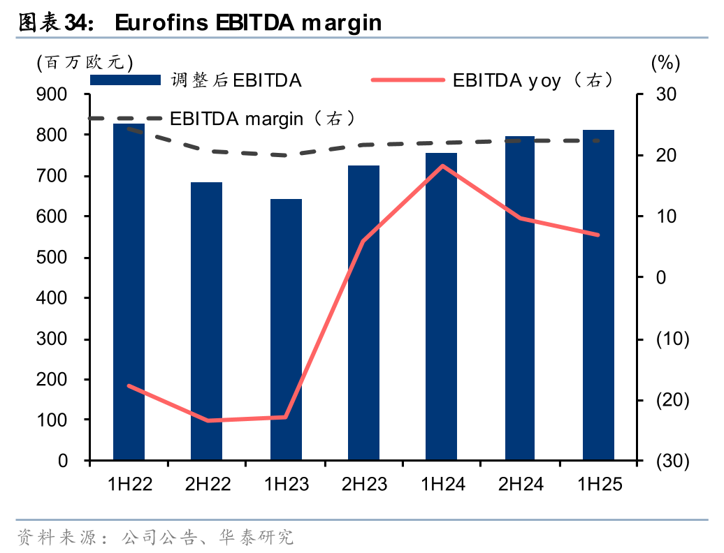 Eurofins(法国):并购驱动的赛道扩张。Eurofins以生命科学检测为核心,1H25实现营收36.12亿欧元,同比增长2.9%;调整后EBITDA达到8.10亿欧元,同比增长7.0%,调整后EBITDA margin提升30bps至22.4%,其中成熟业务板块(占营收93%)利润率达24.1%,已超2027年目标值24%。