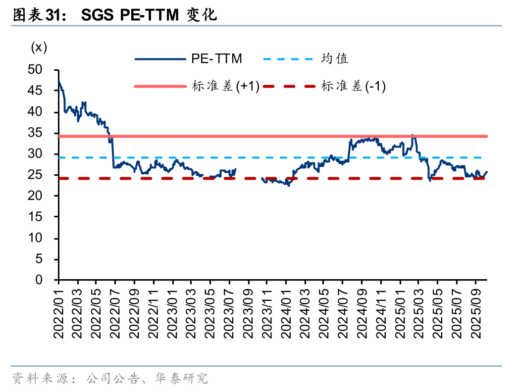 国际龙头SGS、Eurofins、BV和Intertek平均PE约25倍,低于国内龙头的29倍。我们认为国内龙头有望维持溢价,主要得益于全球化网络扩大、高毛利业务和品牌公信力强化。