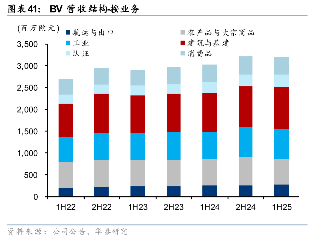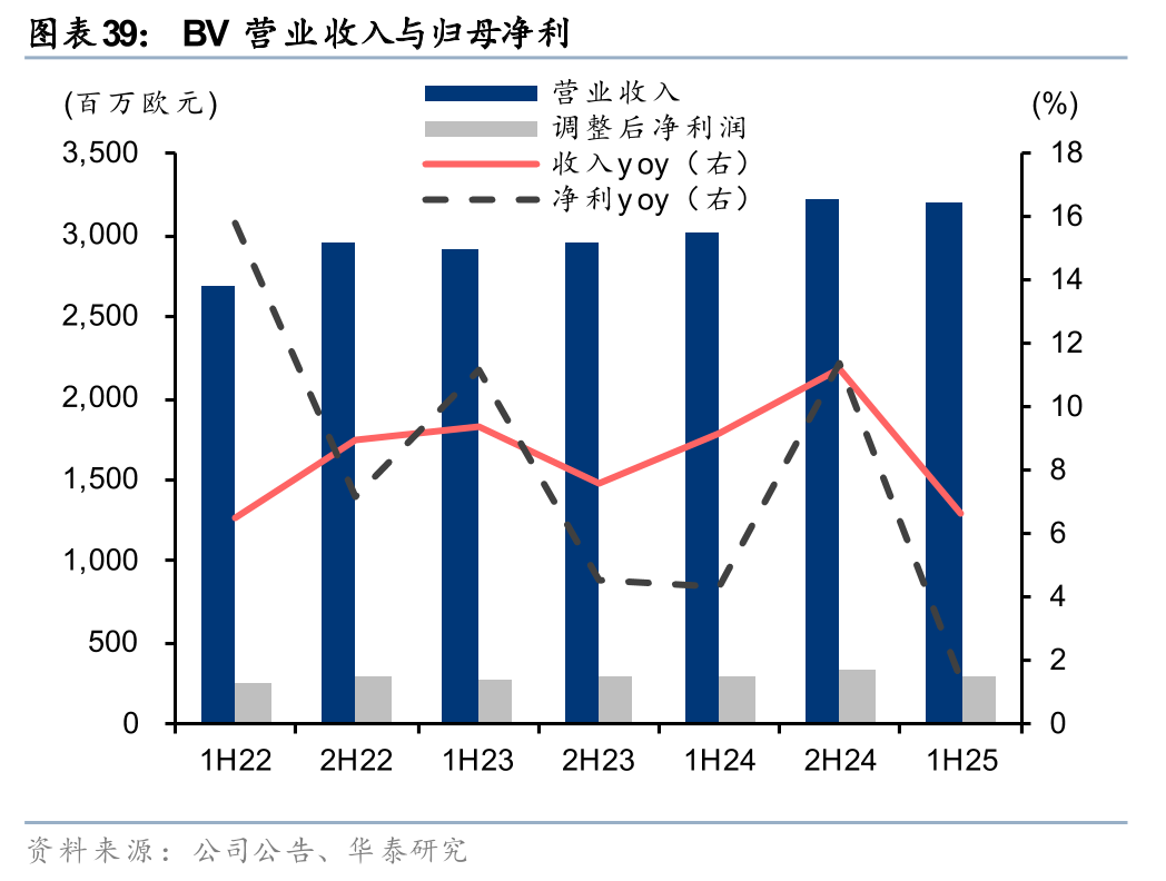 BV(法国):战略聚焦下的盈利跃升。BV1H25实现营收31.925亿欧元,同比增长5.7%,剔除并购及汇率影响后的有机增长达6.7%(Q2单季有机增长6.2%),增速创近三年同期新高。盈利端表现更亮眼,调整后营业利润4.915亿欧元,同比增长8.8%;调整后营业利润率提升44个基点至15.4%,按固定汇率计算提升55个基点,盈利能力持续优化。归属于母公司股东的净利润3.223亿欧元,同比大幅增长37.6%,主要受益于业务结构改善及非经常性收益贡献;经调整每股收益(EPS)0.65欧元,同比增长2.4%,按固定汇率计算增速达6.4%。现金流方面,1H25自由现金流1.68亿欧元,有机增长3.5%,同比下降11.5%主要受食品检测业务剥离的一次性影响,剔除该因素后核心业务现金流韧性强劲。