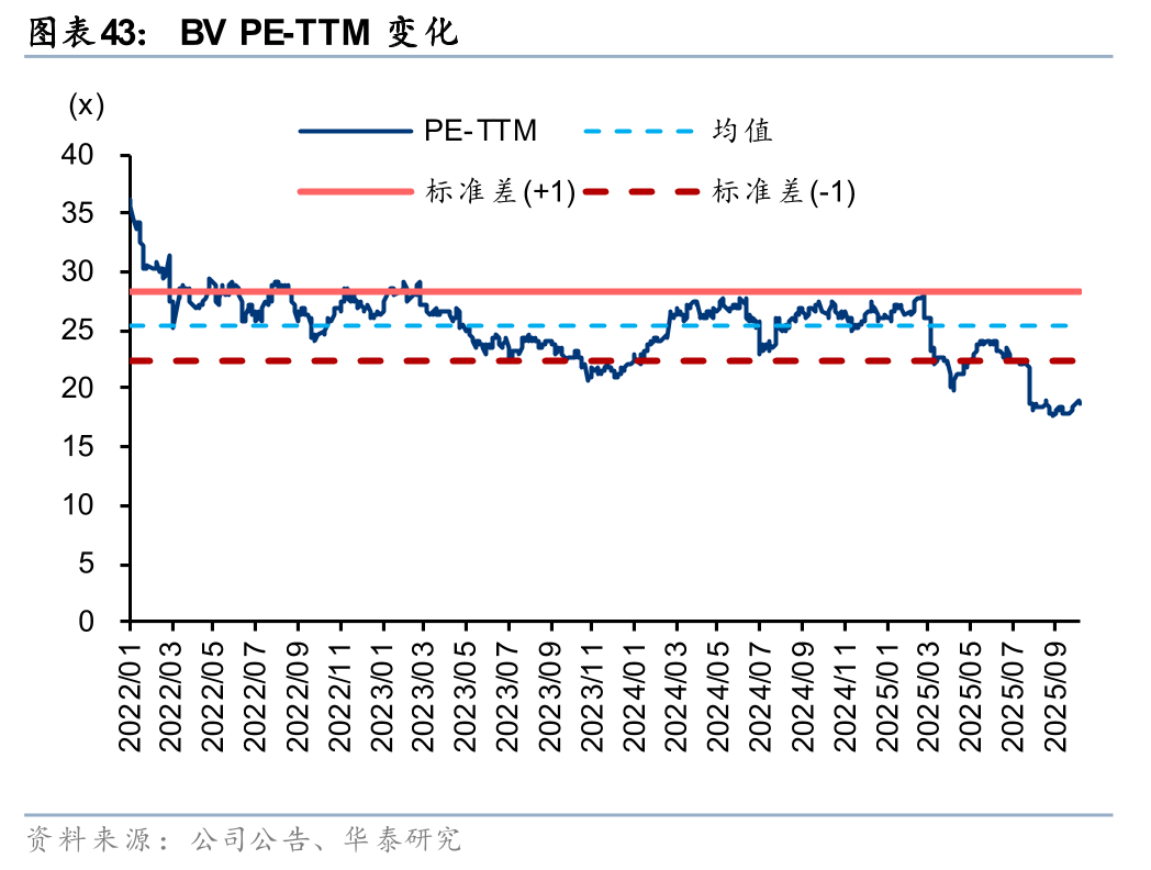 当前BV的PE(TTM)为20x,PS(TTM)为2.04x,PE估值水平低于SGS和Eurofins,主要因市场对其传统工业检测业务占比偏高(约35%)存在增长韧性担忧。但公司15.4%的调整后营业利润率高于行业平均,1.1x的净债务/EBITDA比率显著低于国际同行(SGS 1.8x、Eurofins 2.1x),财务安全性优势突出。