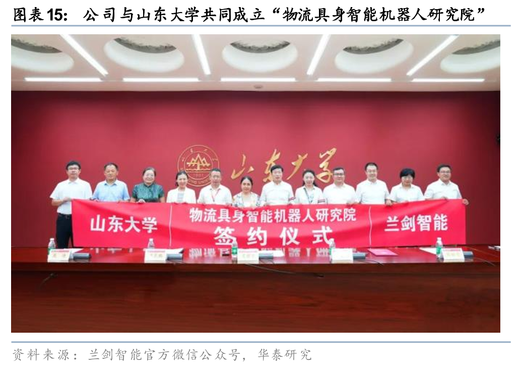 3) 数字化和AI提升企业精细化管理能力。物联网智能管控平台是以物流全程可视化为应用主线,通过对物流全过程的业务节点、数据和视频、能耗、温湿度等传感设备的监控实现对物流作业的实时控制,通过物流关键绩效指标监控发现物流过程存在的问题,通过运行日志记录每天物流运行状态,通过物流分析实现对物流过程的统计分析,通过运行分析报告实现对物流过程的持续改进,帮助企业建立一套闭环的智能化物流过程控制体系,提升企业的整体物流运营水平。此外公司积极布局具身智能机器人,8月29日,兰剑智能与山东大学在山大中心校区正式签署协议,共同成立“物流具身智能机器人研究院”。双方将深度融合产学研资源,加快推进具身智能机器人尤其是人形机器人在物流细分场景中的研发与产业化落地。