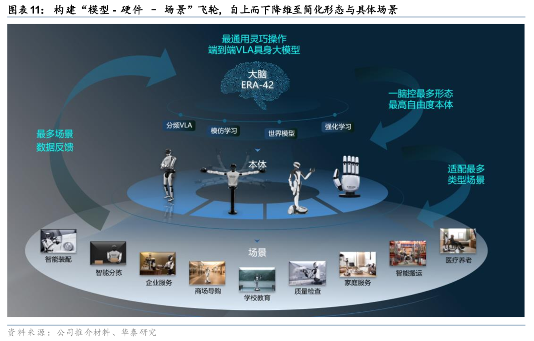 3、星动纪元:人形机器人产业核心矛盾在于场景碎片化导致边际成本高昂,难以规模化。星动纪元提出“通用大脑+通用本体”软硬全栈自研路径,以Era-42端到端VLA模型统一控制55自由度本体,首创快慢系统、世界模型及强化学习框架,实现从互联网视频零样本预训练到真机微调,突破数据瓶颈;硬件模块化复刻1:1人形,兼容人类数据,构建“模型-硬件-场景”飞轮,自上而下降维适配,打造物理世界通用智能体。